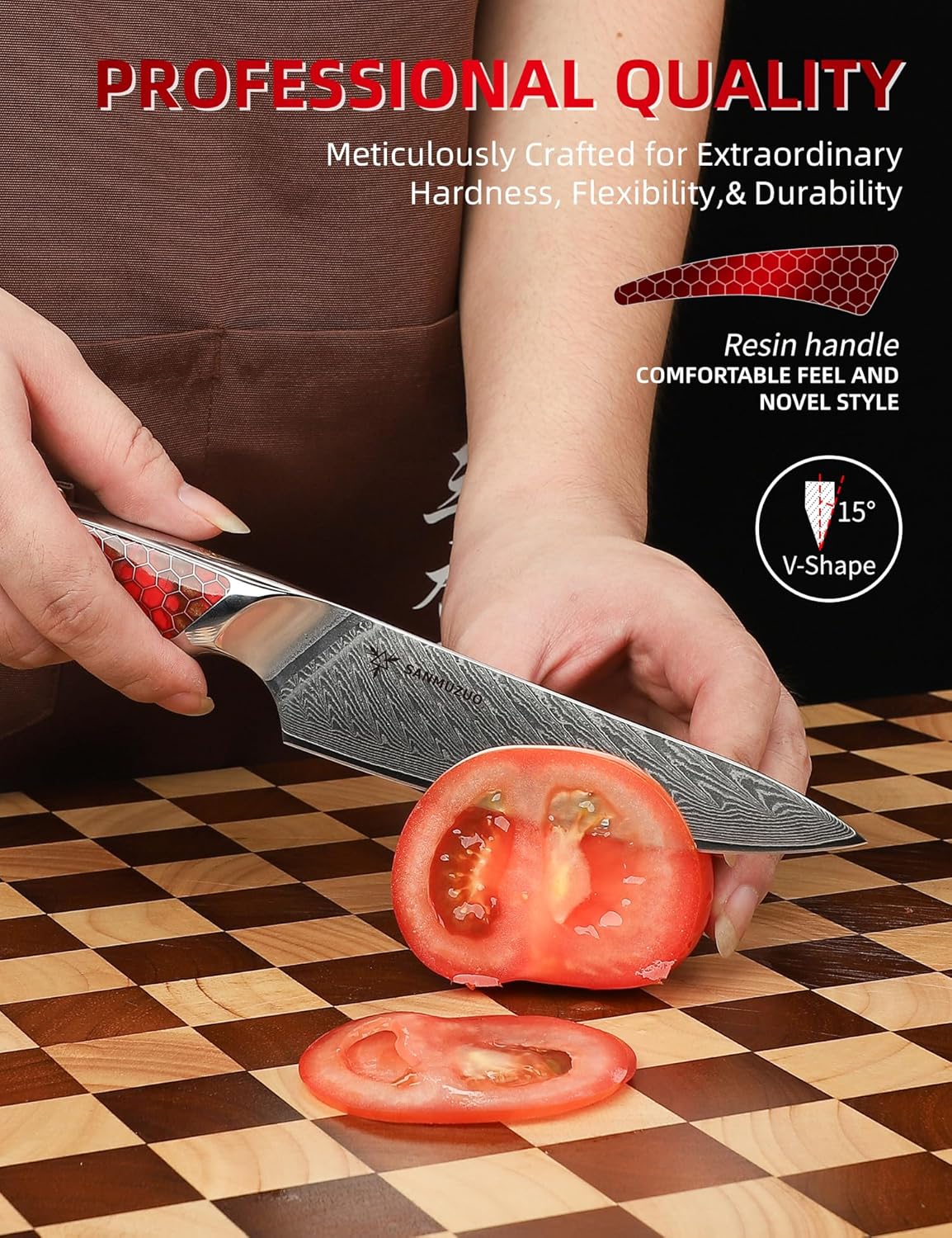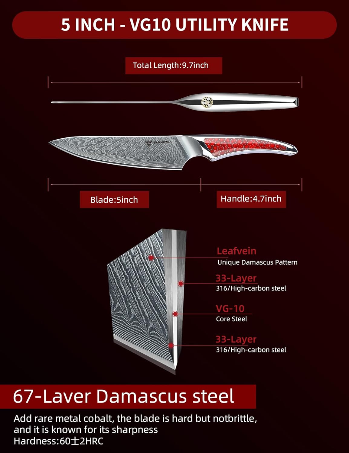 5 inch Utility Knife, Japanese VG-10 Damascus Steel Kitchen Knife, Ultra Sharp Fruit Knife with Full-tang Handle in Red Resin, LA-S9 Series