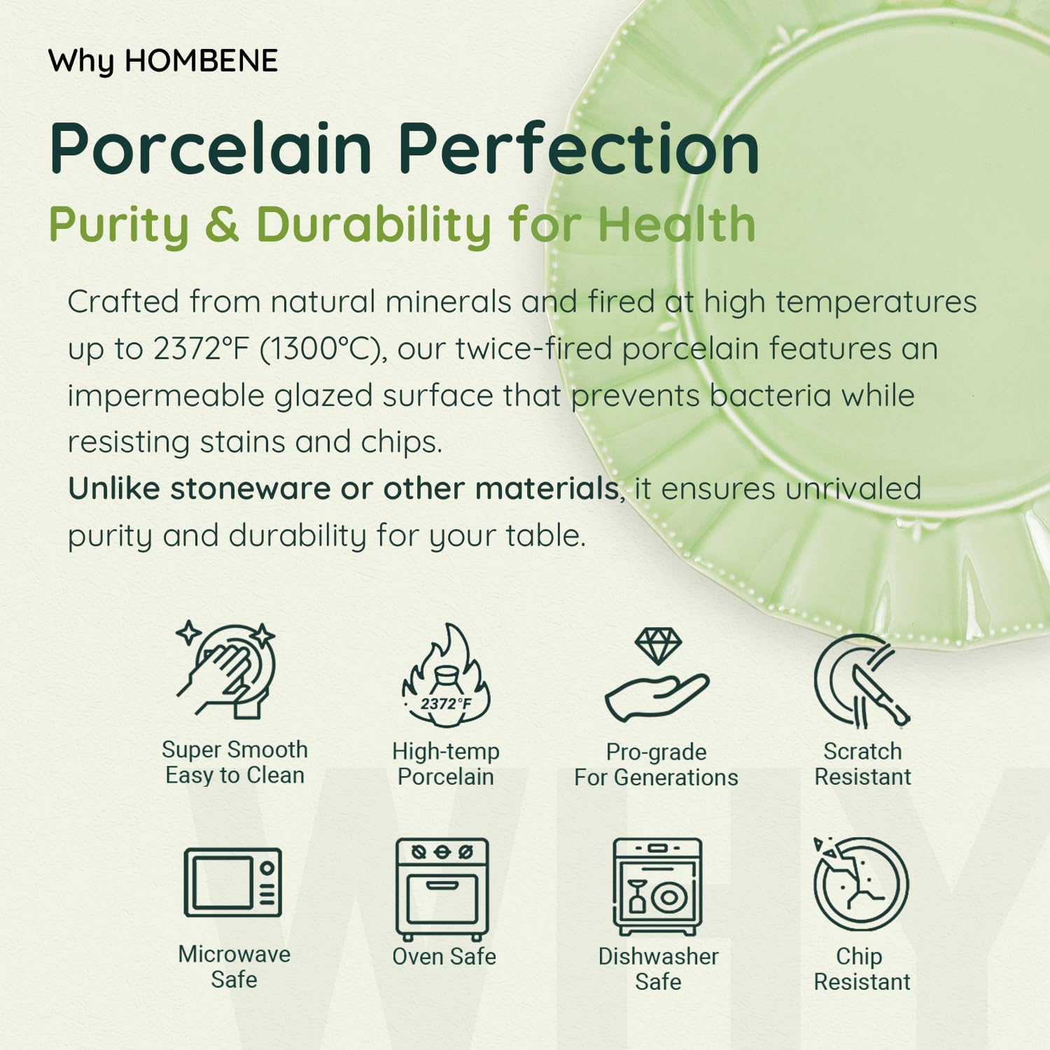 • Fine Porcelain Colors Your Table. The fine ceramic dinnerware allows light to pass through. The refreshing Mint Glow Green adds a touch of modern freshness to your table, perfect for those who love a subtle yet vibrant pop of color.
