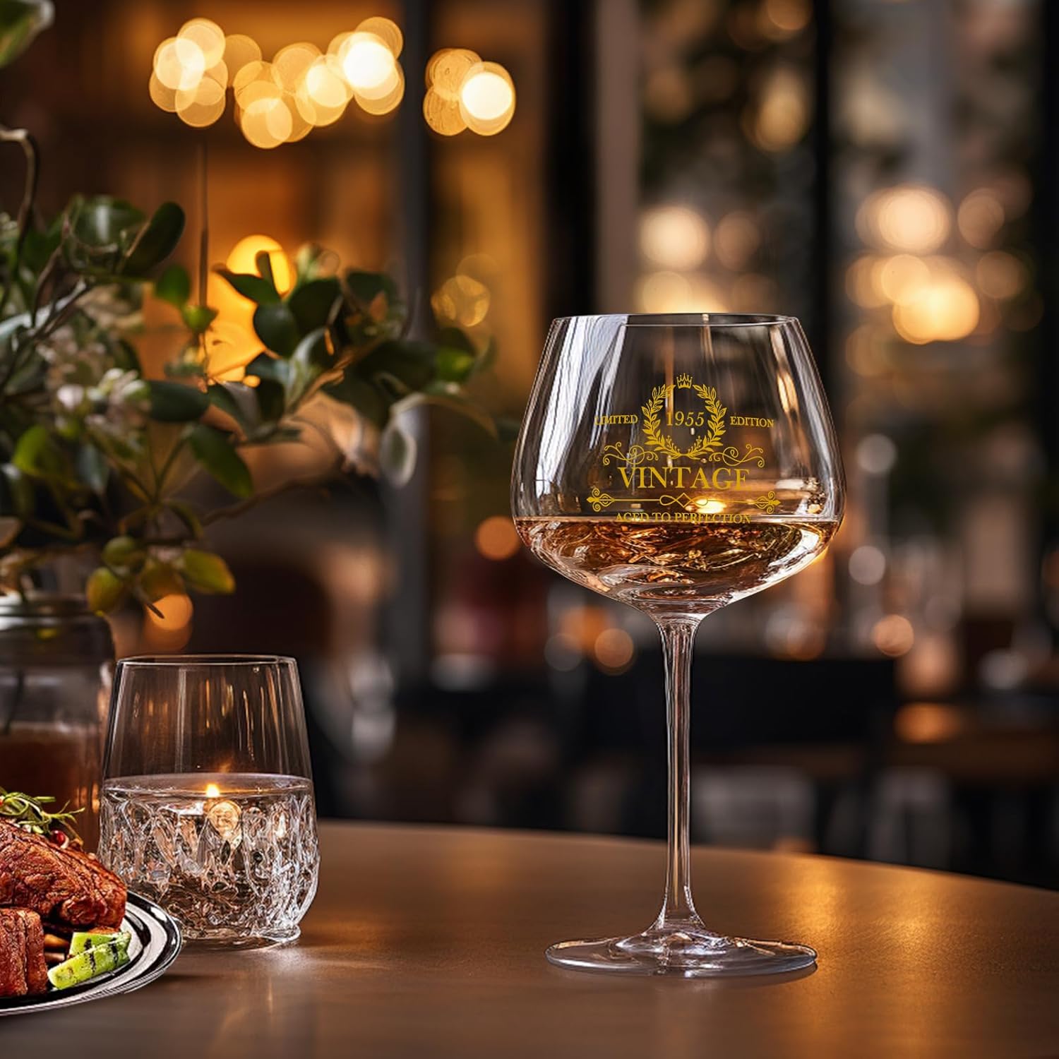 • More Noble Golden Printing Letter - The Crystal Gift glass stamped with Golden letter “LIMITED EDITION 1955 VINTAGE AGED TO PERFECTION”, adding an extra touch of nobleness and luxury. The pattern on the glass is baked at high temperature to ensure it more durable, without worrying about fading or peeling off. Exclusively crafted for her 70th birthday gift, this wine glass displays a 1955 imprint, the year she was born. This distinctive feature turns the glass into a cherished artifact, symbolizing her journey through seven decades.