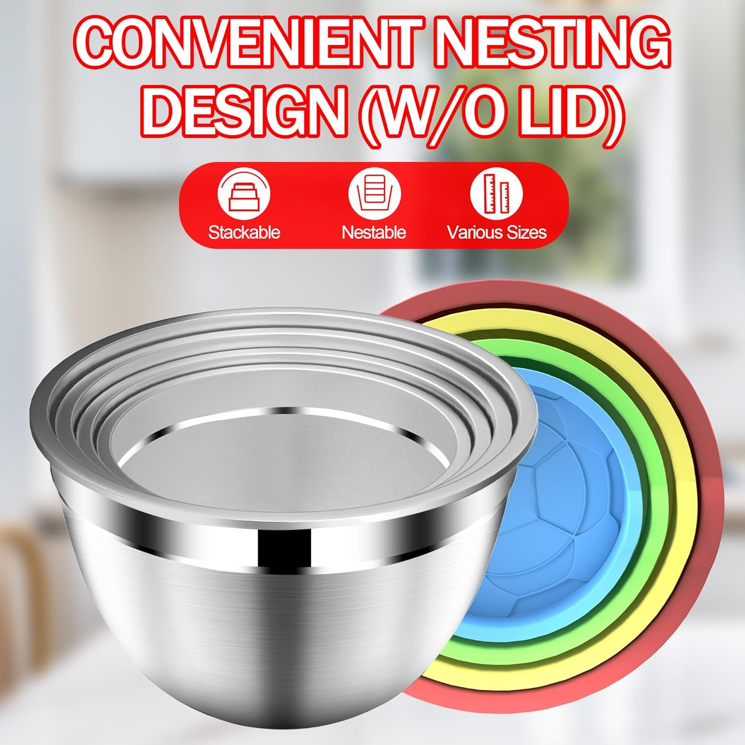 • [Nesting Bowls & Strainer] The stainless steel mixing bowls are available in 1.5Q, 2Q, 2.5Q, 4.5Q in a variety of sizes to give your kitchen more flexibility. Each bowl is nestable to save space on your counter. The colander with feet can be nested with the biggest bowl. So you can even drain hot pasta anywhere easiy and safely.