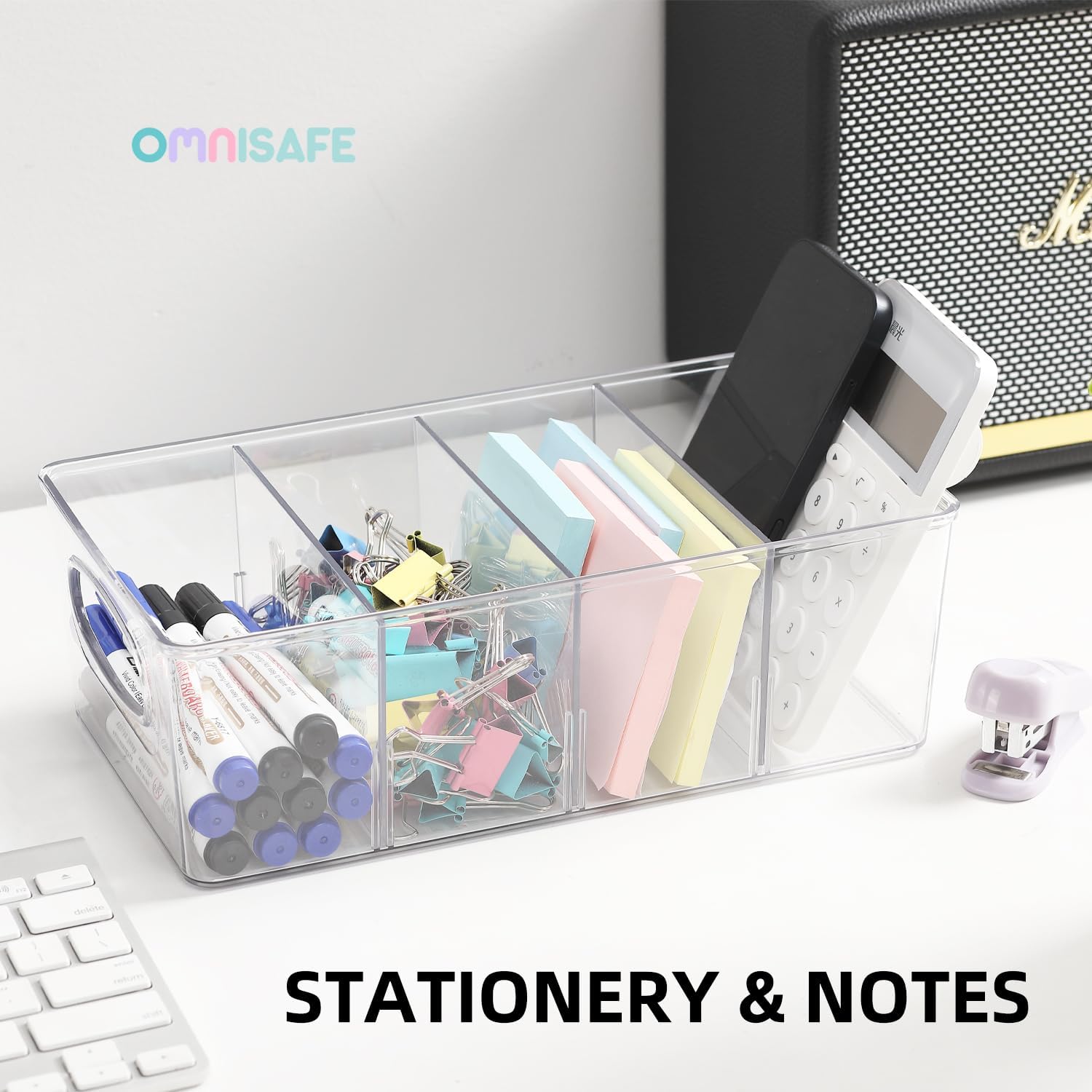 4-Section Divided Storage Plastic Bins, Clear Plastic Food Storage Organizer for Kitchen, Snacks, Spice Packets,Pouches, Stackable Tea Bag Storage Bin (6 Pack)