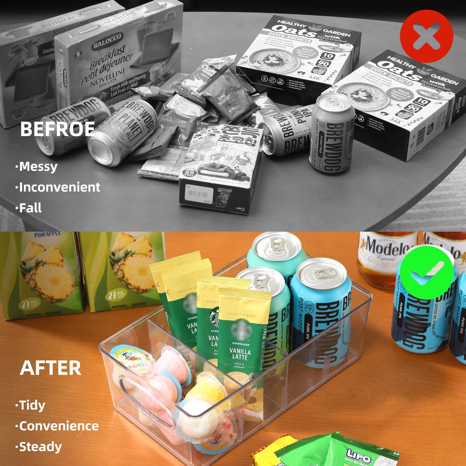 • Easy to Tidy: 4 spacious areas provide plenty of space to store, organize and separate tea bags, coffee bags, fruit, office supplies, pepper packs, canned drinks, cosmetics, lipsticks, and other needs, Each food storage tissue box has 3 removable partitions to easily separate and organize your items