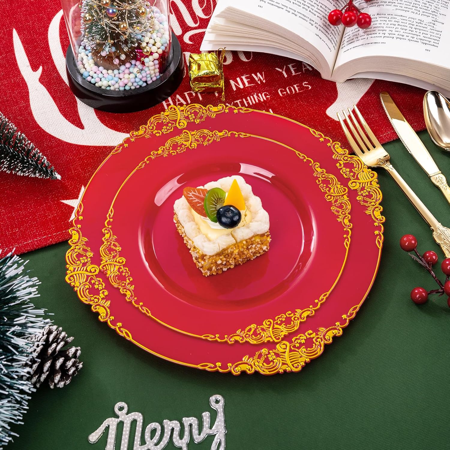 102PCS Red and Gold Plastic Plates - Red Plates Disposable - Vintage Plastic Plate with Gold Rim Include 51PCS Dessert & 51PCS Dinner Plate Perfect for & Weddings & Christmas Parties
