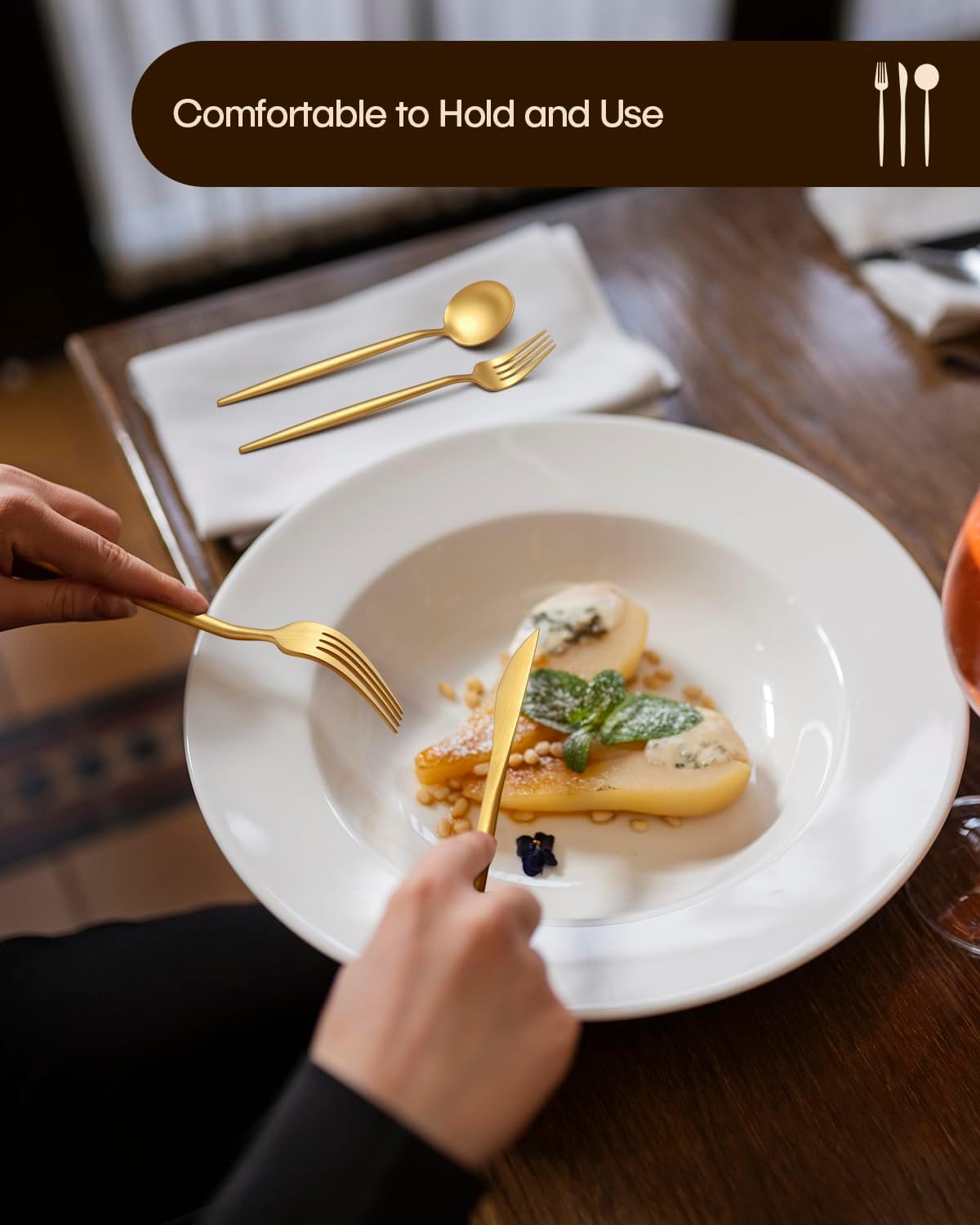 • SLEEK AND ELEGANT DESIGN - These gold utensils have classic profiles and clean lines, with a distinct sense of design and luxury that can match well with any style you already have. The matte gold finish, special shape, and exceptional quality add an elegant touch to any table setting. Perfect gift for your family and friends.