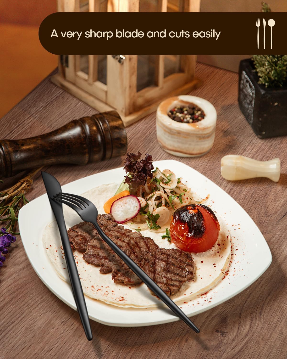 • 40PCS BLACK FLATWARE SET FOR 8 - Including 8 dinner knives, 8 dinner forks, 8 dinner spoons, 8 salad forks, and 8 teaspoons. Perfect for any occasion, from everyday family meals to joyous gatherings and formal banquets. Create cherished memories during candlelight dinners, celebrate holidays like Thanksgiving with elegance, or elevate your BBQs and weddings to a new level of sophistication.