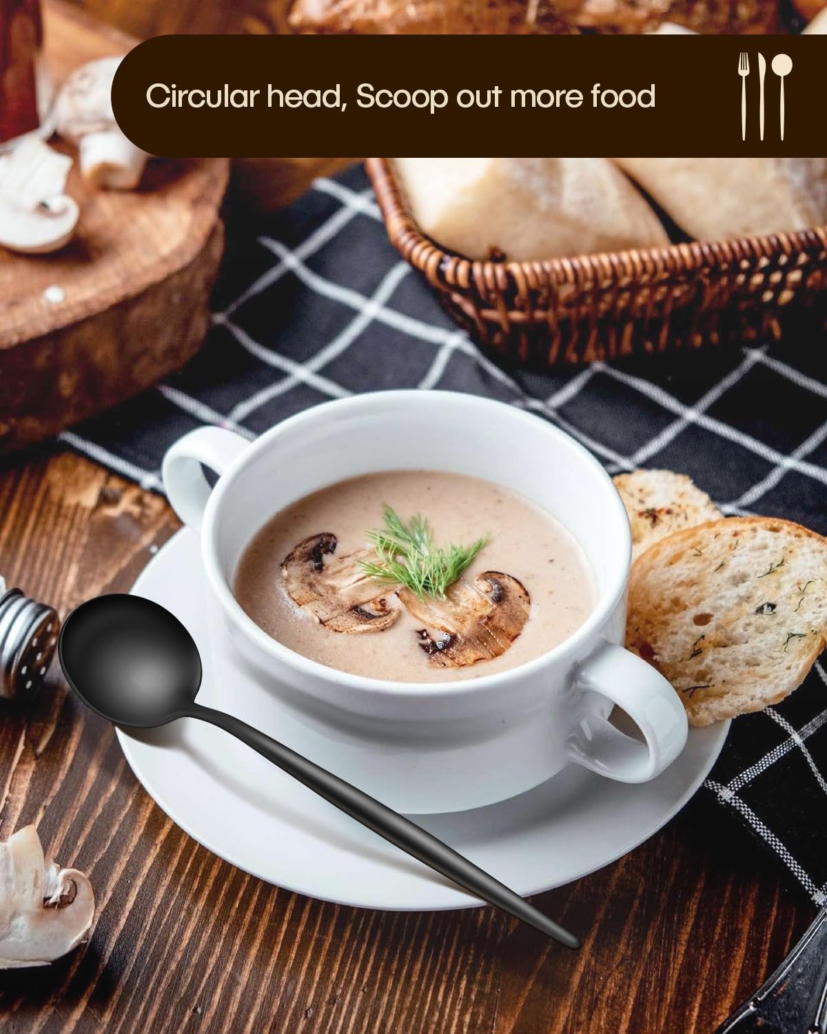 • ERGONOMIC HANDLE, PROPER WEIGHT - The elegant rounded curves make them timeless, with proper gauge thickness and weight to hold comfortably. A smooth edge ensures safety and no scratches, each black utensil set is solid, well-balanced, and comfortable. A good set of tableware will make you feel happy and increase your appetite when eating.