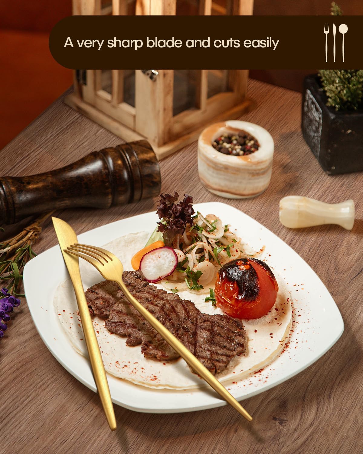 • FOOD GRADE STAINLESS STEEL - Our gold silverware is made of premium stainless steel, it offers nice resistance to rust and corrosion to get the most sturdy and healthy experience while using, and never bends in daily use, much better than the cheaper ones. You will be well impressed by the good quality from the first sight of it.