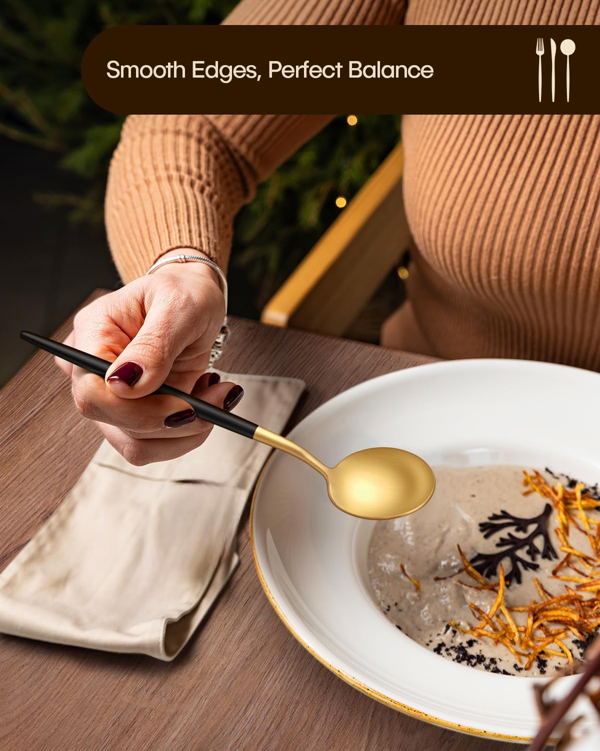 • SLEEK AND ELEGANT DESIGN - This matte gold silverware set with a black handle has classic profiles and clean lines, with a distinct sense of design and luxury that can match well with any style you already have. The matte black finish, special shape, and exceptional quality add an elegant touch to any table setting. Perfect gift for your family and friends.