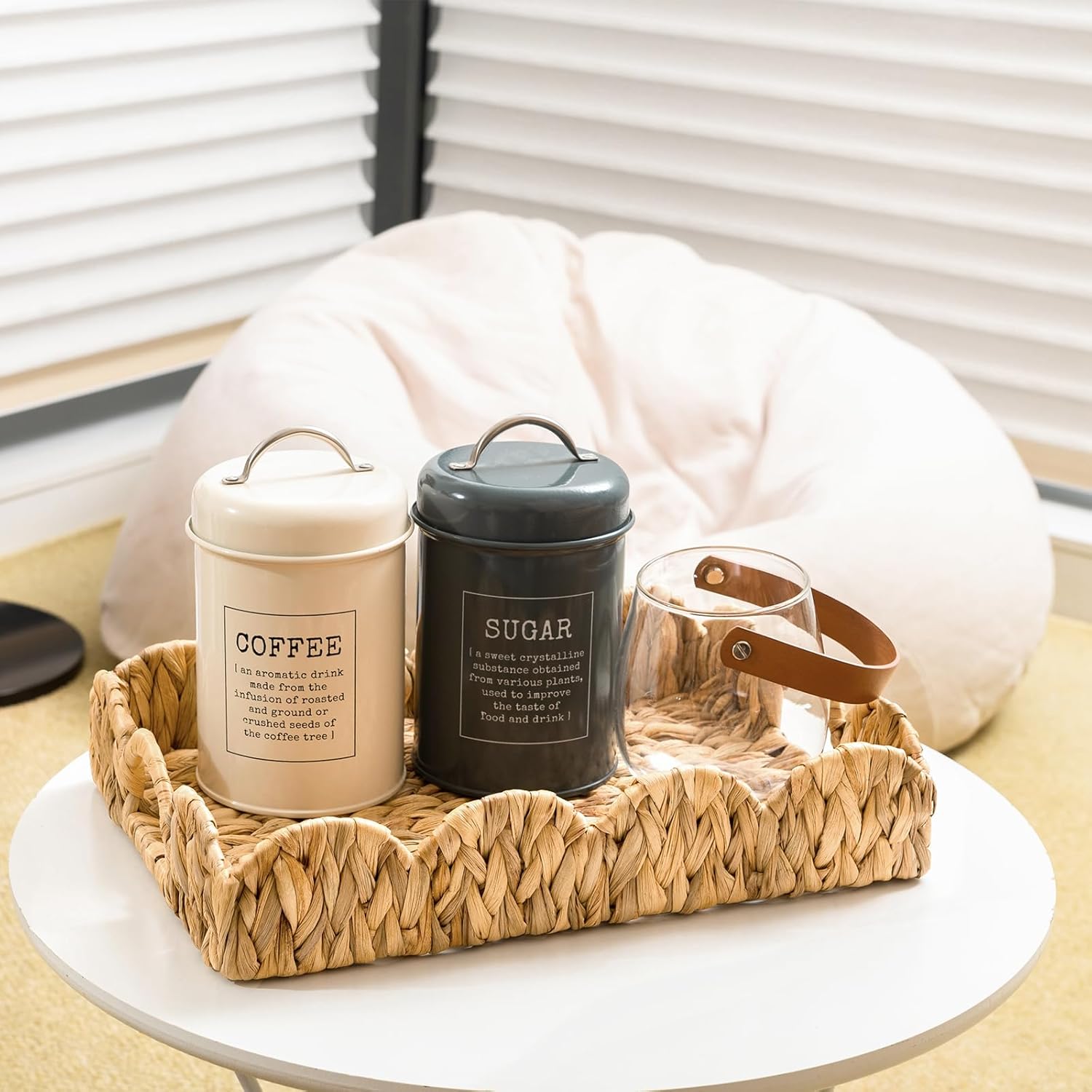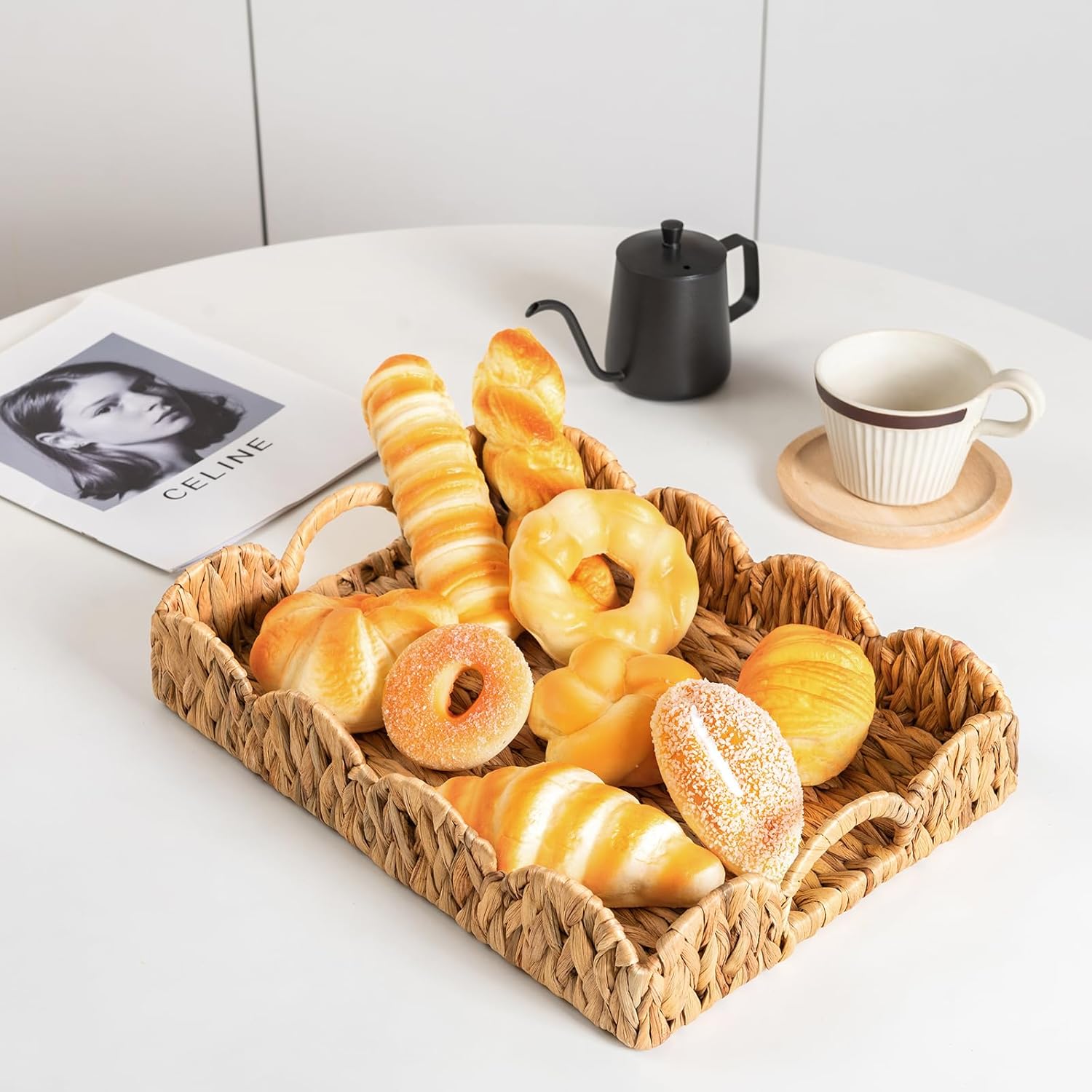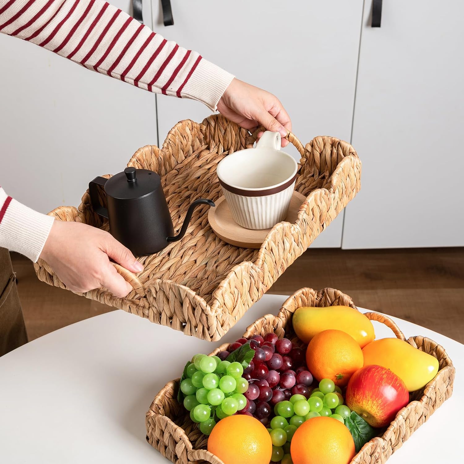 Large Rectangle Serving Tray, 2-Pack Rattan Scalloped Tray with Handles, Wicker Trays for Decor, Hand-Woven Water Hyacinth Coffee Table Tray for Home Decoration