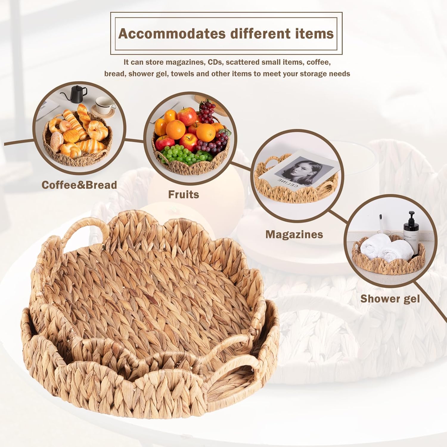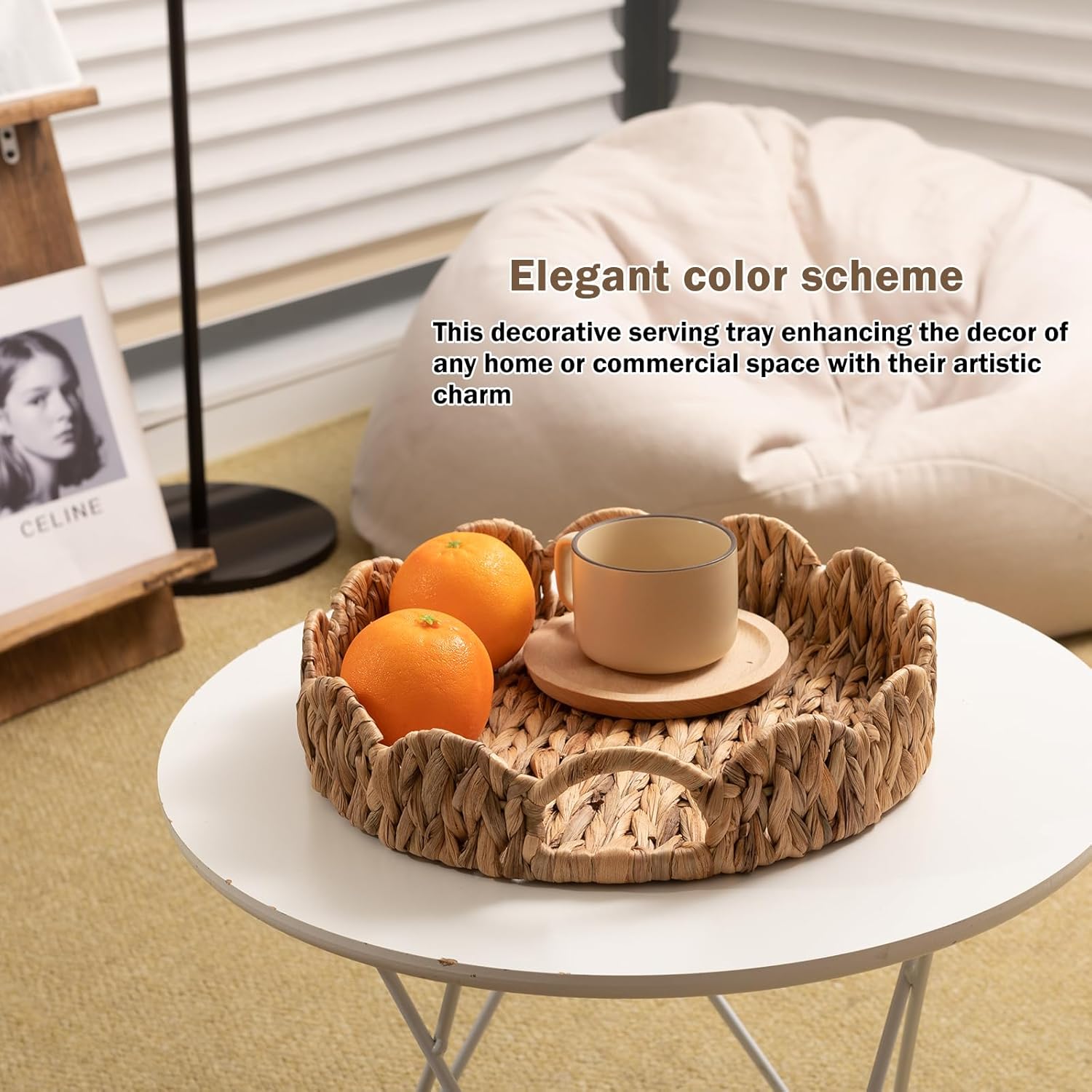 Scalloped Edge Round Tray, Round Serving Tray with Built-in Handles, Wicker Woven Decoratve Tray Basket Organize for Coffee Table Home Decor, Water Hyacinth Rattan Tray,Set of 2, Natural
