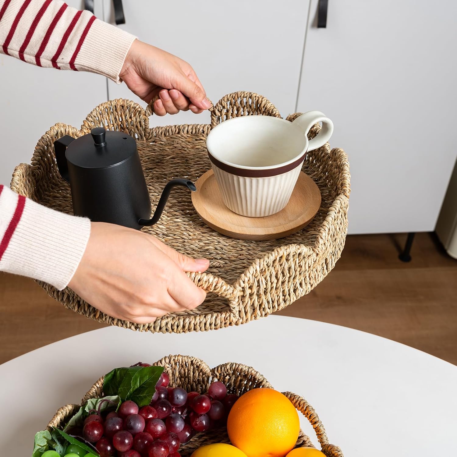 Scalloped Serving Tray, 13.8" Woven Round Table Decor Tray, Wicker Rattan Basket with Handles, Natural Seagrass Tray for Room Decor, Set of 2