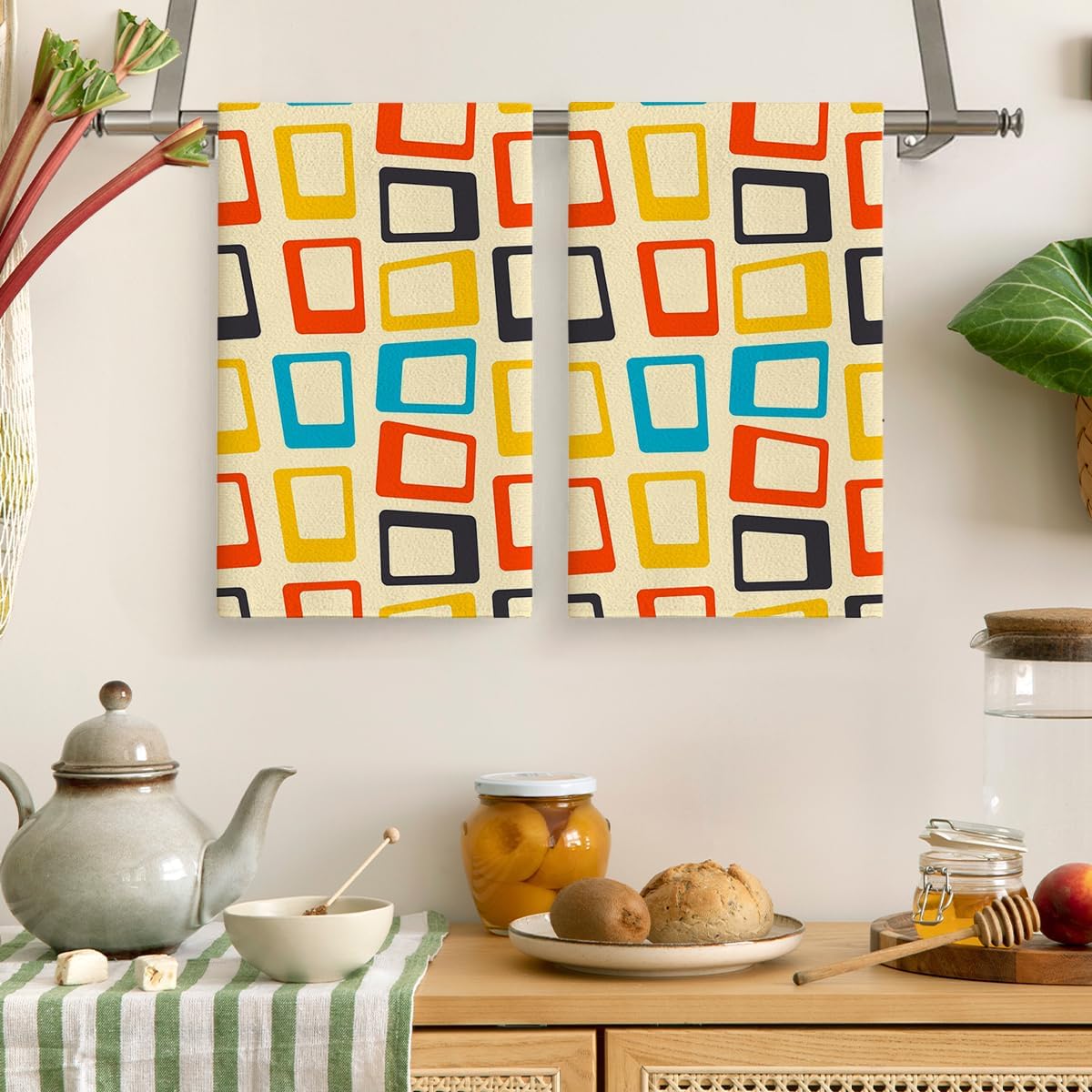 • Mid century Modern kitchen drying towels set of 2 measuring 16"x24"/40cmx60cm, and each of them is designed with a hanging loop for easy storage.