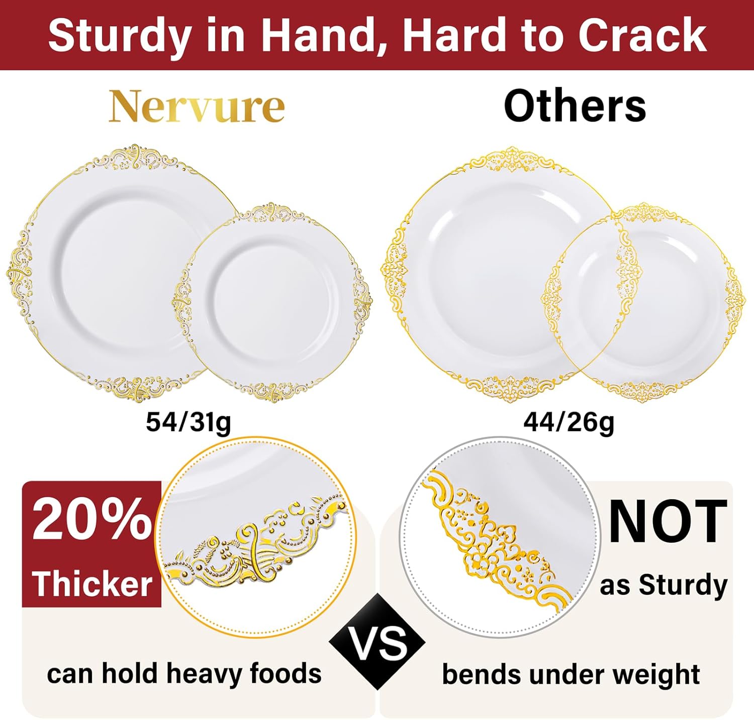 • Perfect For Any Occasion: These white disposable plates are designed for using at parties, weddings, luncheons, family gatherings, engagement parties, BBQs, Thanksgiving day, dinners, reunions, birthdays, fiestas, retirement celebrations, picnics, buffets, catering, food services and more! There is always a time when disposable gold plastic plates sets are convenient.