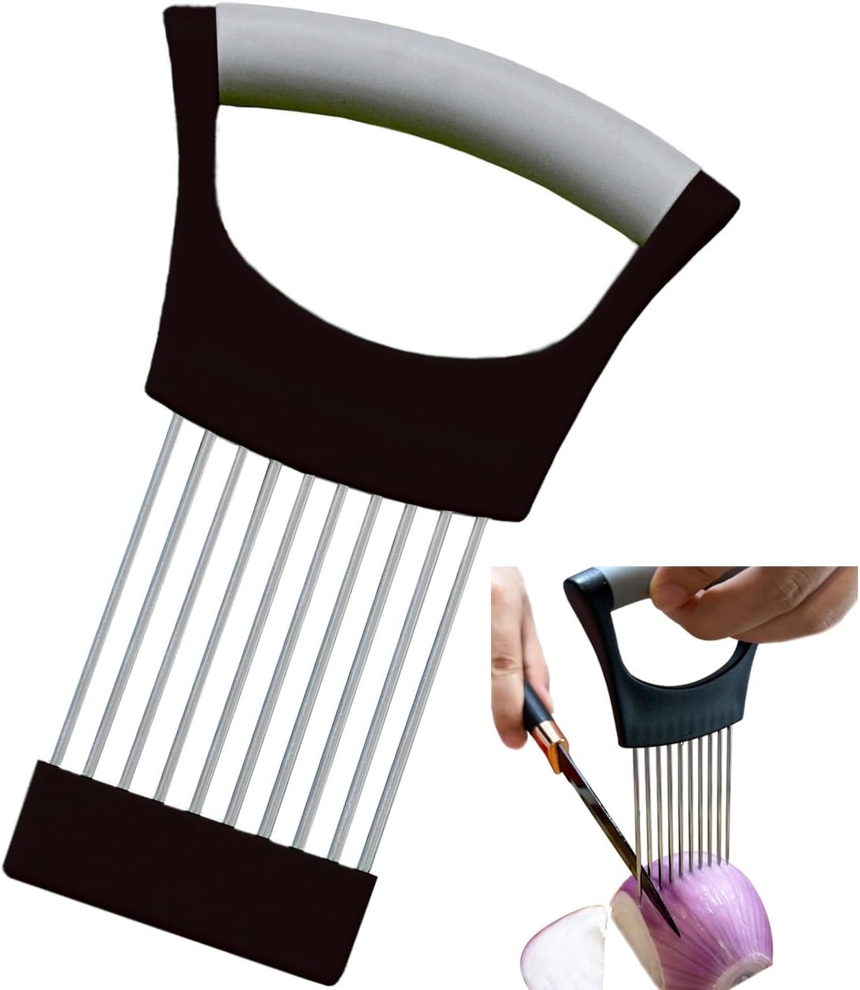• Safe and Easy To Use:With this onion cutter assistant tool, you can easily slice without touching the food and never have the onion/fish smell on your hands again.When you hold hot meat for slicing, your fingers won't burn and the meat won't slide around.It always keeps your fingers away from the knife and makes cutting neat slices a breeze.Save time and improve your cooking skills.