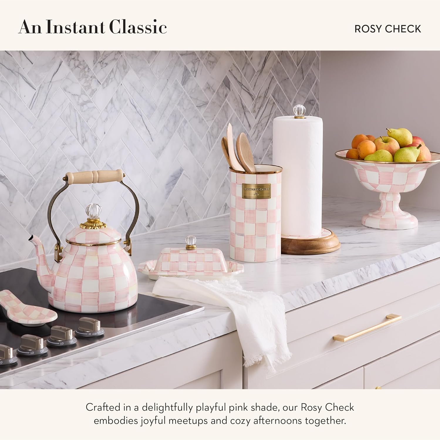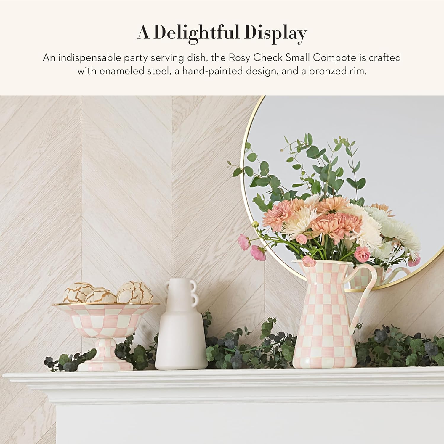 • ELEGANT SERVING ESSENTIAL: Great for serving and entertaining, the Rosy Check Enamel Compote is an elegant pedestal bowl for any dining table. It features hand-painted pink-and-white checks over a steel underbody and has a stainless-steel rim.
