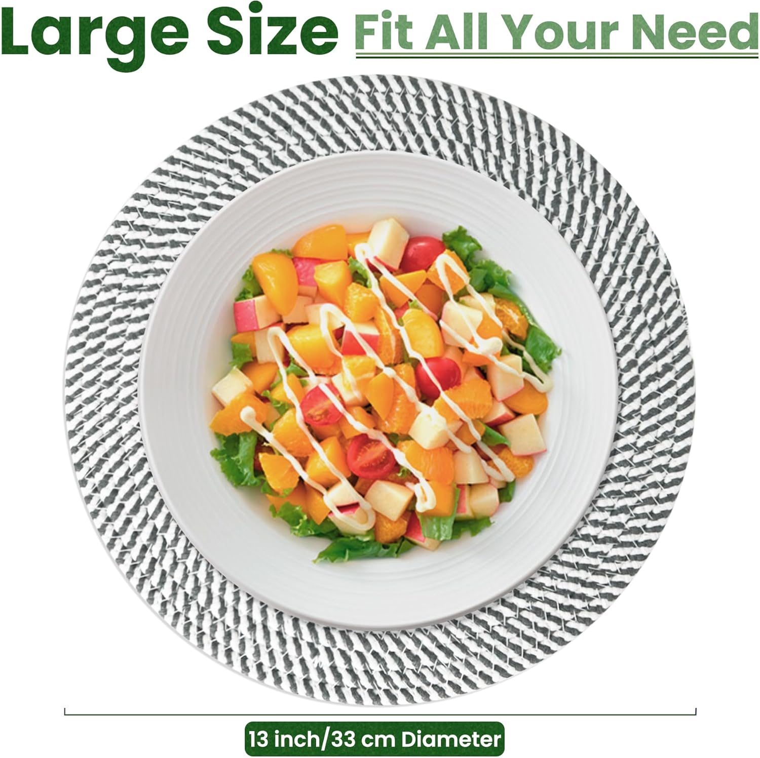 • Premium Fabric: Our round woven trivets are made from high-quality cotton ropes, featuring premium Hot-Air cotton inner fabric, make they are heat-resistant, soft-touch, water-absorbent, resilient, and slightly flame-retardant. The thickened place mates are tightly woven with dense stitching, ensuring they don't loosen and can be used repeatedly