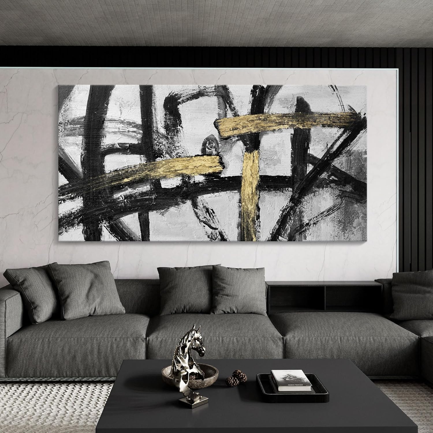 Large Black and White Wall Art, Modern Paintings Gold Abstract Graffiti Canvas Artwork Wall Pictures for Living Room Bedroom Dining Room Home Office Decor 24x48 In