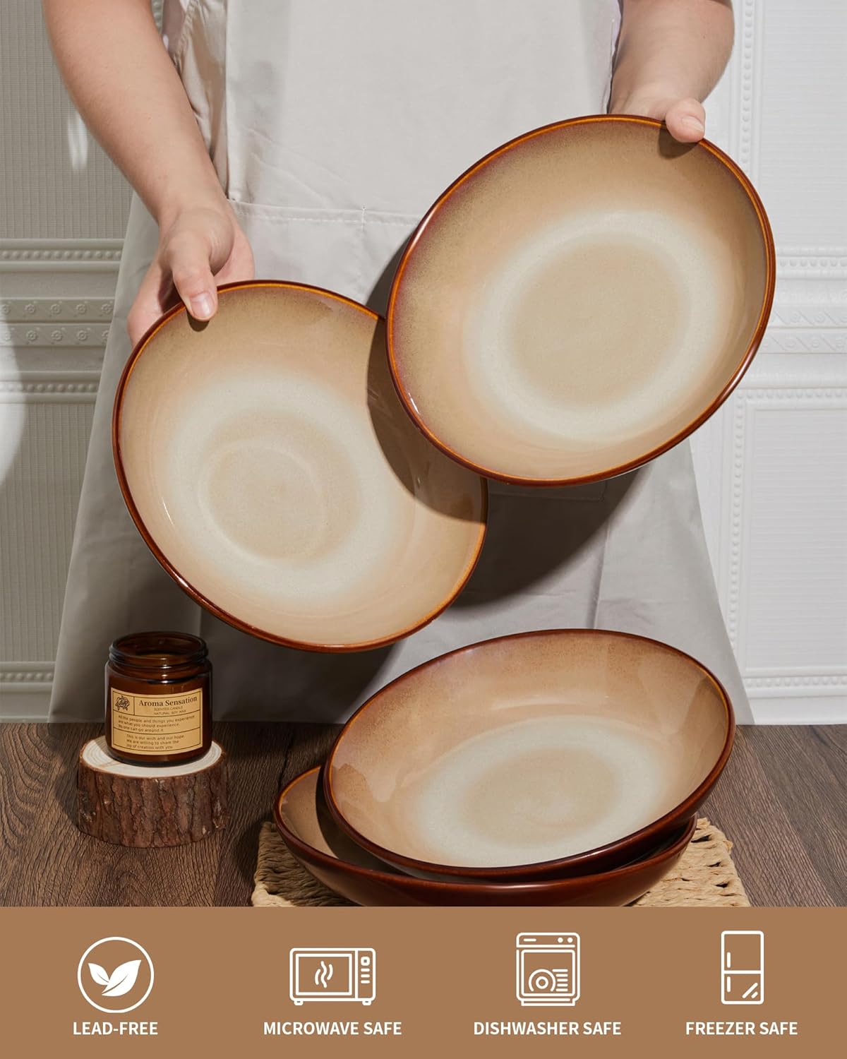 Ceramic 32 Oz Pasta Bowls, 8.75 Inch Reactive Glaze Pasta Bowl Set of 4, Microwave & Dishwasher Safe, Large Wide Serving Bowls for Salad, Dessert, Soup, Fruit, Brown and Yellow