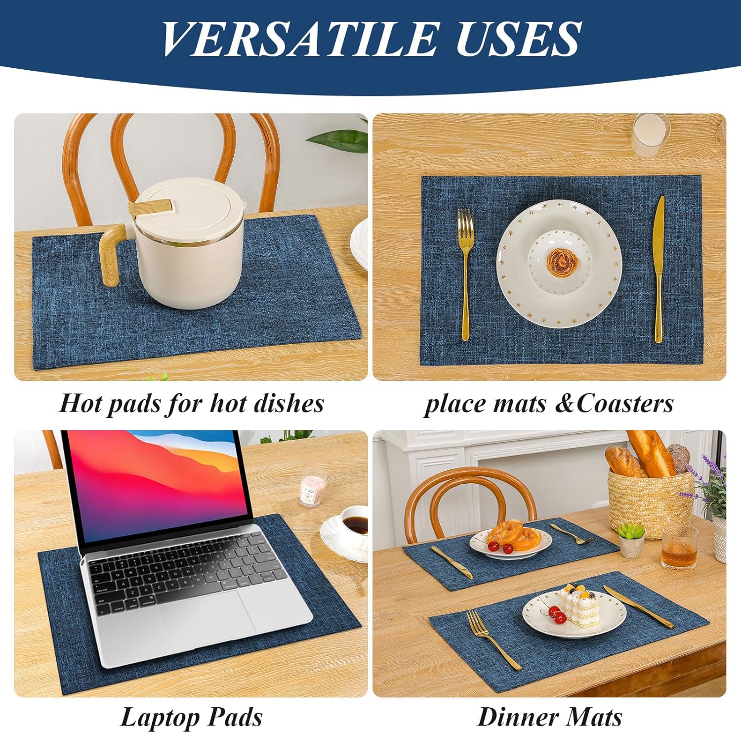 SHACOS Cloth Fabric Placemats Set of 4 Washable Non Slip Heat Resistant Table Mats Double Layer Reversible Place Mats Stain Resistant Indoor Outdoor, Dark Blue