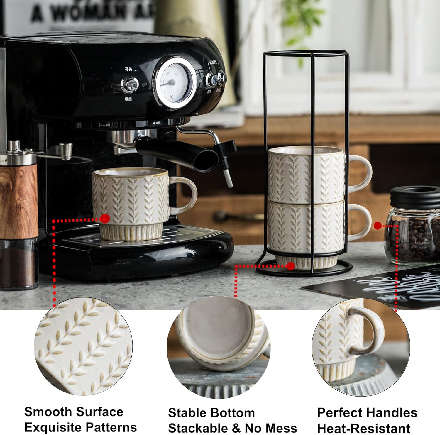 Coffee Mugs Set of 4 with Spoons & Stand, Stackable Espresso Cups 13oz Coffee Mug for Drinks Latte Cappuccino Tea, Coffee Cup for Women Men Couples Housewarming Birthday Gift, Dishwasher Safe