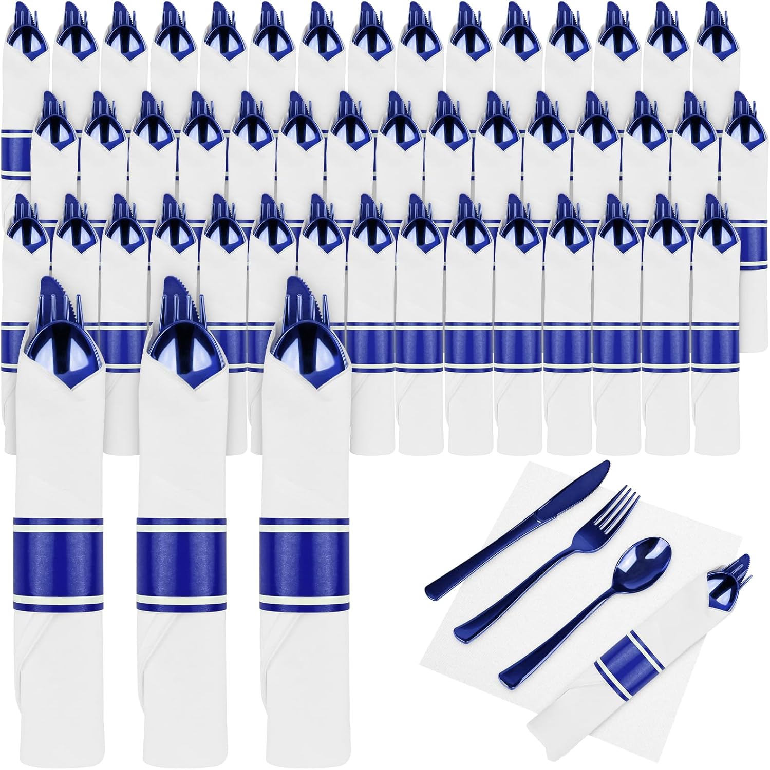 • Complete Value Pack: Serve your guests in style with these 100 pieces each of blue plastic forks, spoons and knives, along with 100 dinner napkins. Ideal for various occasions like weddings, birthdays, or just a simple dinner party, this designer pre-rolled silverware set is sure to enhance every mealtime experience