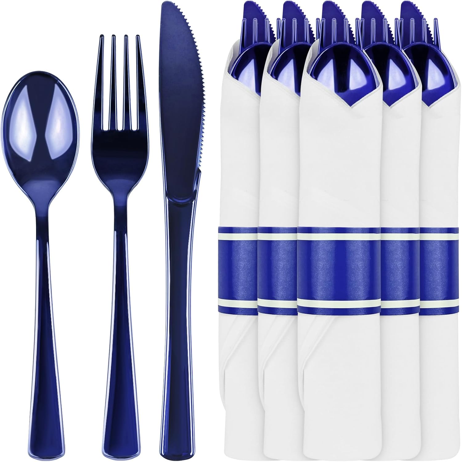 • Elegant & Luxurious - Impress your guests with an exquisite blue plastic silverware set wrapped in white dinner napkins. This luxurious color adds a touch of elegance and refinement to your next party or dinner function