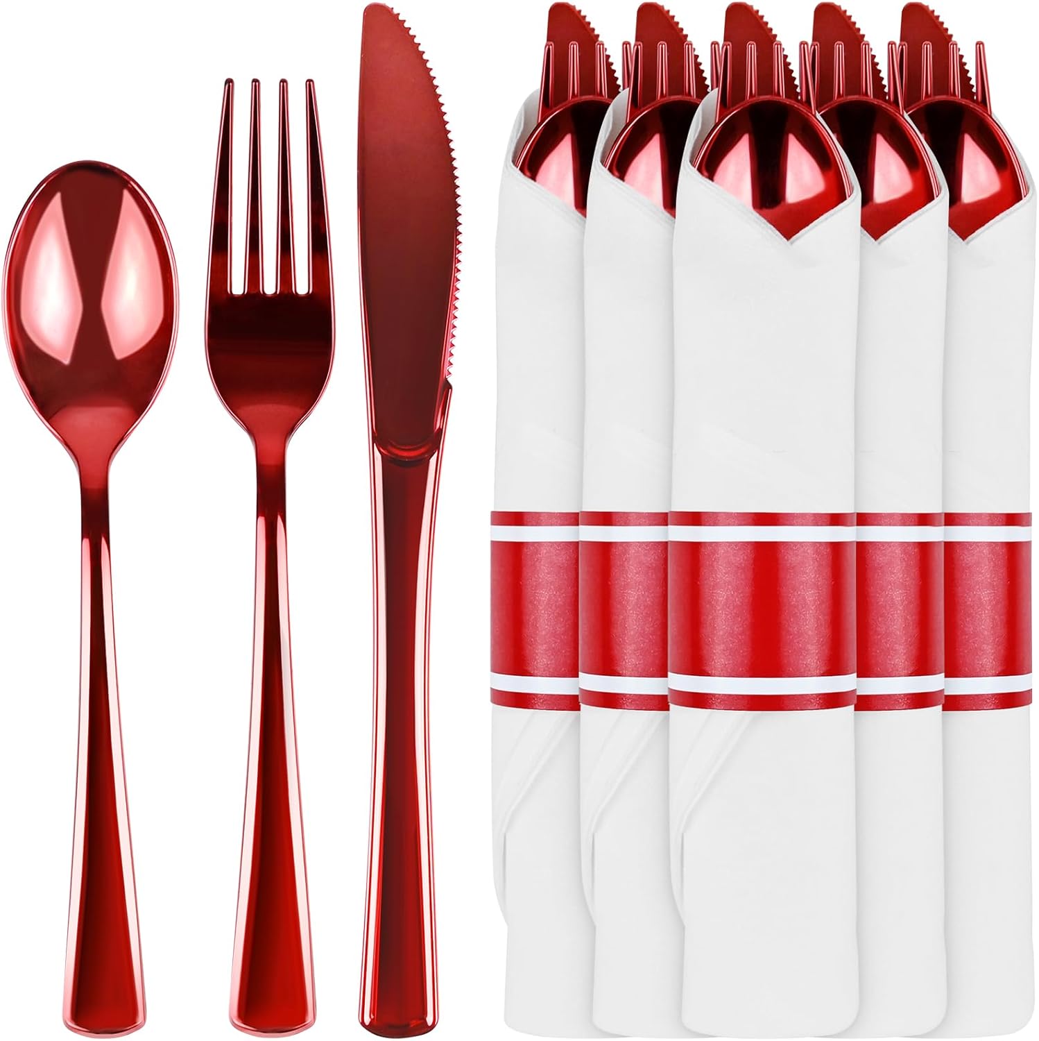 • Serve 30 with Ease - Total 30 pack of pre rolled red plastic cutlery set with dinner napkins make it easy to serve your guests breakfast, lunch, dinner or buffets. Cleanup couldn't be easier since you just need to throw it away after use