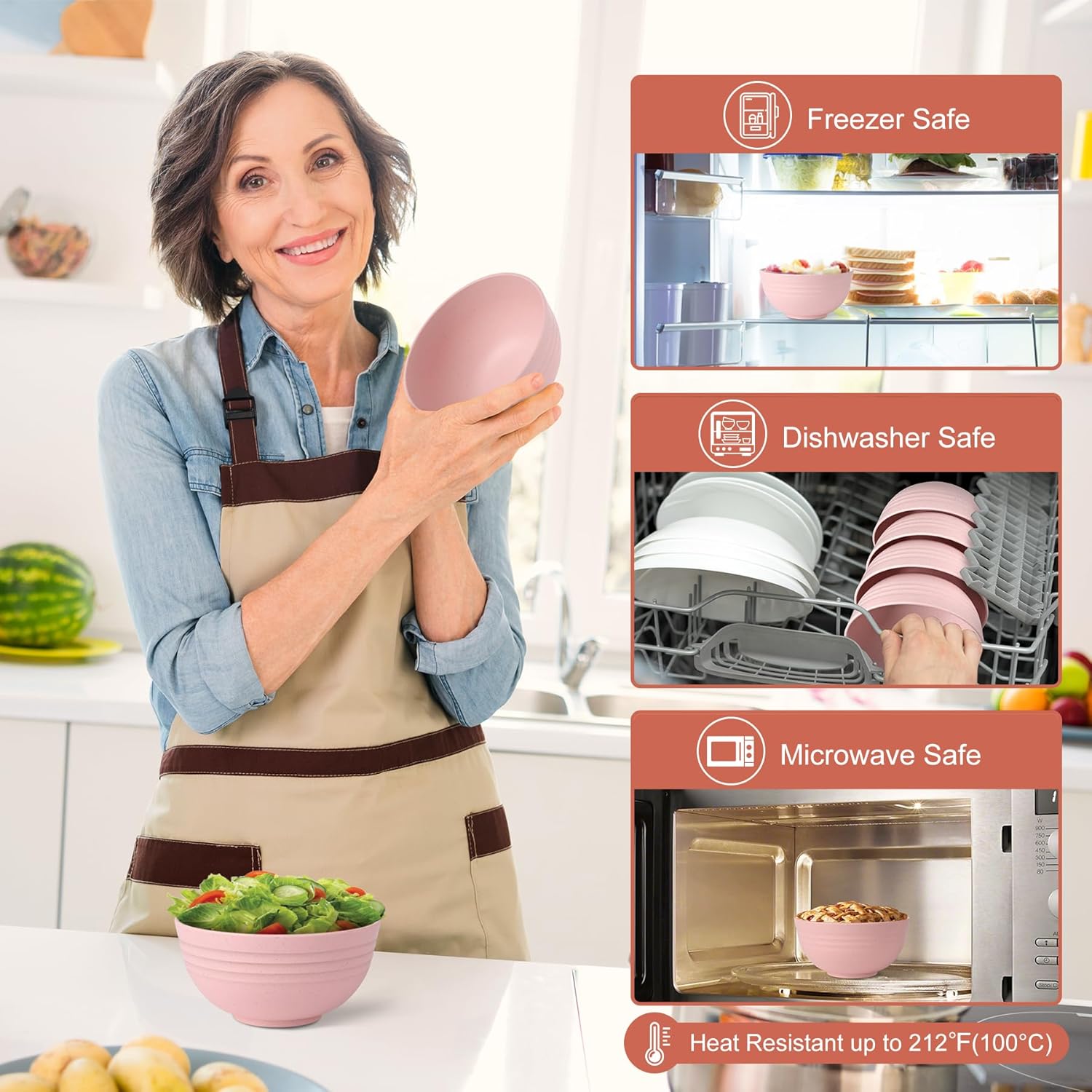 HOTEC Unbreakable Wheat Straw Cereal Bowls - Microwave & Dishwasher Safe Soup and Salad Bowls, Set of 8, 26oz, BPA Free,Pink