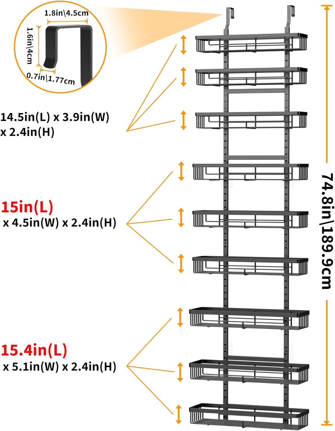 • You will get 3 large shelves (15.3"L x 4.9" x 4.1"H), 3 medium shelves (14.9"L x 4.3" x 3.7"H), 3 small shelves (14.5"L x 3.7"W x 3.3"H), including all necessary mounting hardware. The overall height after installation is 6.2ft, suitable for most doors. USPTO Patent Number:29884987