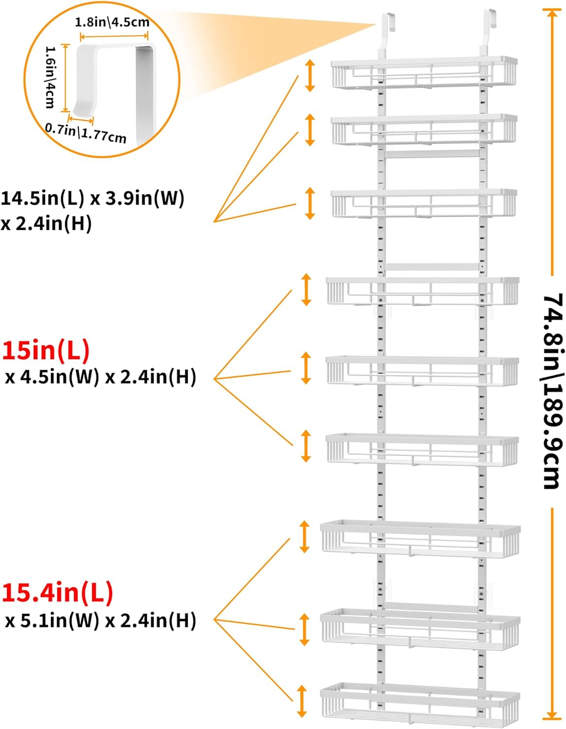 • You will get 3 large shelves (15.3"L x 4.9" x 4.1"H), 3 medium shelves (14.9"L x 4.3" x 3.7"H), 3 small shelves (14.5"L x 3.7"W x 3.3"H), including all necessary mounting hardware. The overall height after installation is 6.2ft, suitable for most doors. USPTO Patent Number:29884987