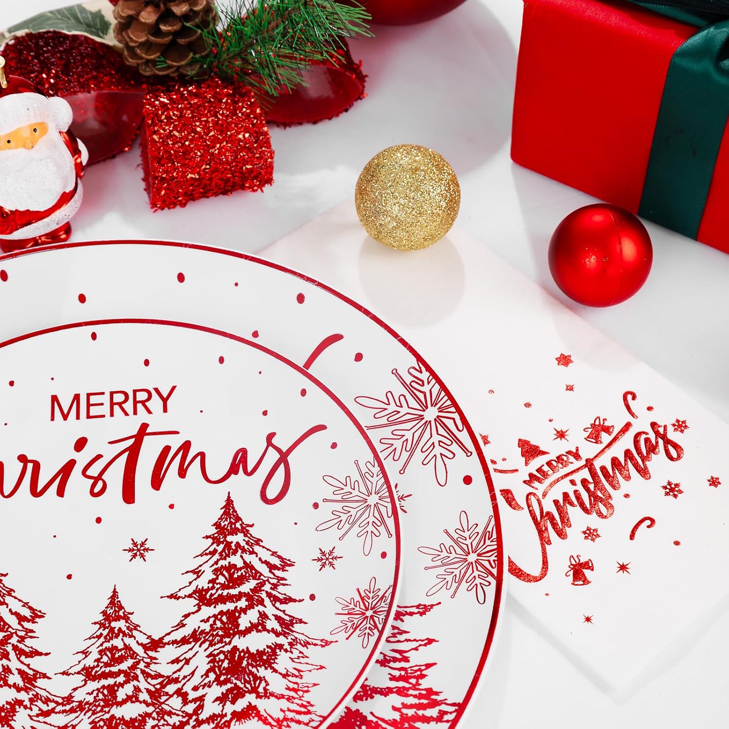 • Rich Stamping Pattern: christmas plastic plates disposable decorated with charming Christmas elements is painted with delicate festive motifs. Several majestic Christmas trees are decorated with dazzling snowflakes. Whether it's kids, loved ones, or friends alike, they'll love these red Christmas plastic plates and there's no doubt that they'll be the perfect choice for your party.