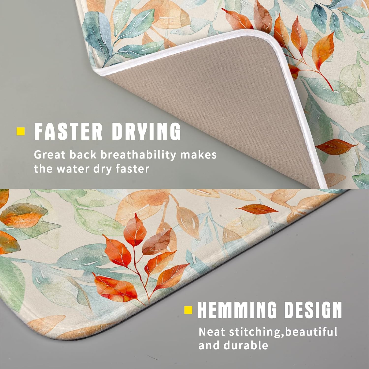 • 【ABSORBENT MATERIAL】-- This fall leaves dish drying mat is made of absorbent microfiber and composite sponge material in the middle, which quickly absorbs water to keep the kitchen countertop dry and clean. Use alone or together with a dish drainer. Our no-slip base adds stability when drying glassware or other fragile items.