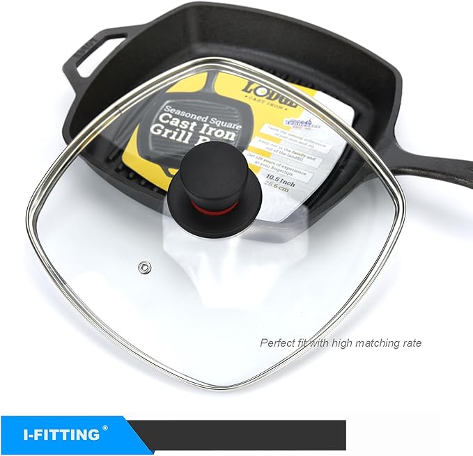 • [Be Appropriate for] Fits most 10.5inch square skillets, frying pans, pots or sauce pans with an 10.5inch diameter square rim. Such as Lodge 10.5inch Square Cast Iron Skillet (L8SQ3) and 10.5inch Square Cast Iron Grill Pan (L8SGP3) .