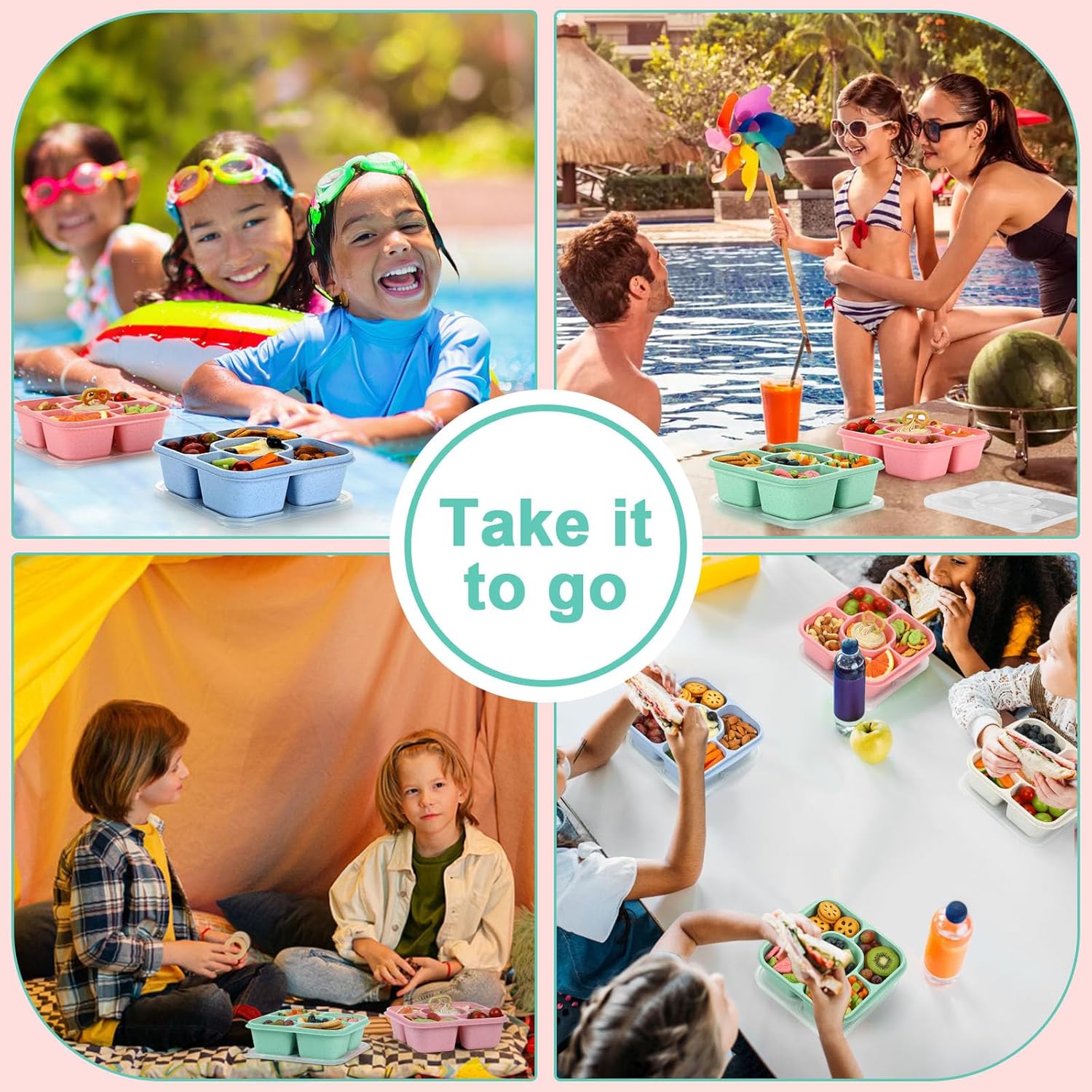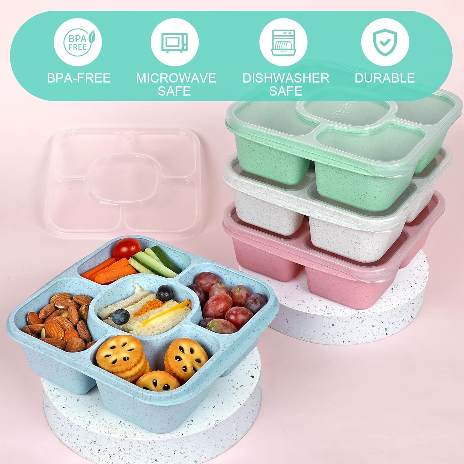 • WHAT YOU GET - 4-Pack 5-compartment bento snack containers with lids, and caring customer support. If you experience an issue with your product, get in touch with us for a satisfied solution.