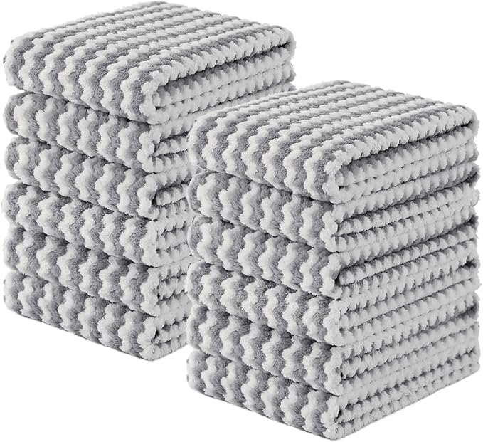 Homaxy Kitchen Towels(12 Pack, 10 x 20 inches), Ultra Soft and Absorbent Dish Towels, Reusable Fast Drying Microfiber Cleaning Cloth, Coral Velvet Wave Design No-lint, Grey