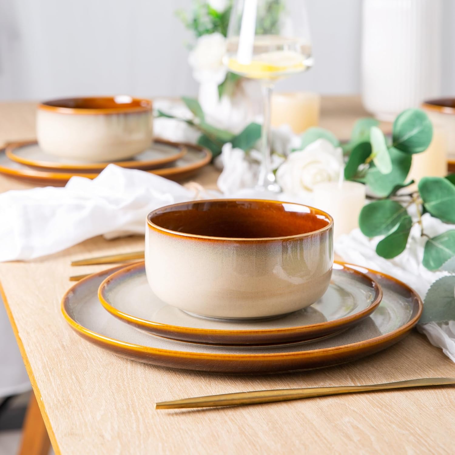• 【 ELEGANT AND STYLISH DESIGN 】This dinnerware sets leads the dining trend with its expressive colors and finishes. With its vibrant color palette and captivating finishes, it creates an alluring ambiance that exudes warmth. The eye-catching reactive glazes and rich, vivid hues not only soothe the senses but also elevate your dining experience. The generously-sized plates provide ample space for displaying your delectable creations, while their deep bottoms prevent any sauce from spilling over.