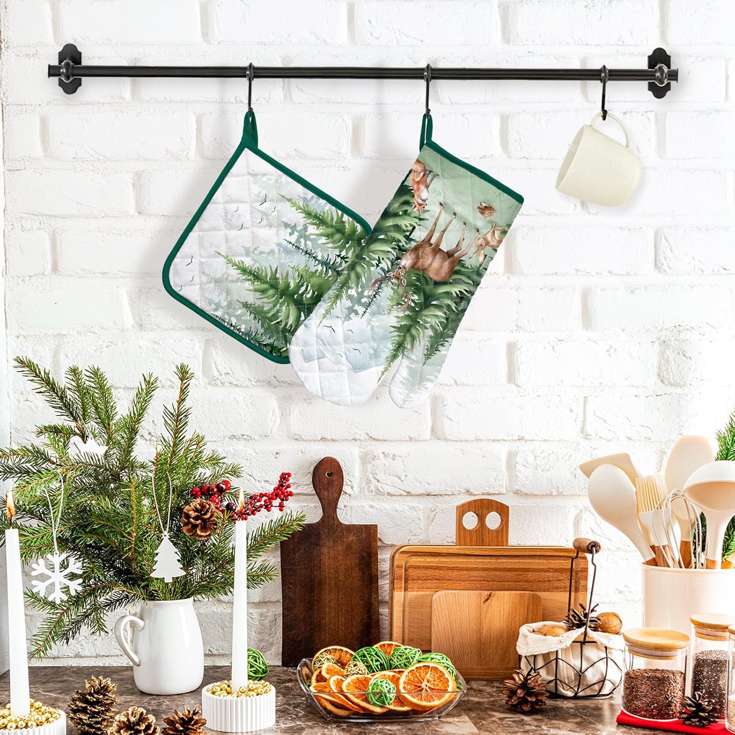 Woodland Deer Oven Mitts and Pot Holders Sets 2Pcs, 100% Cotton Heat Resistant, Extra Long Oven Gloves Potholder for Kitchen Cooking Baking Decoration