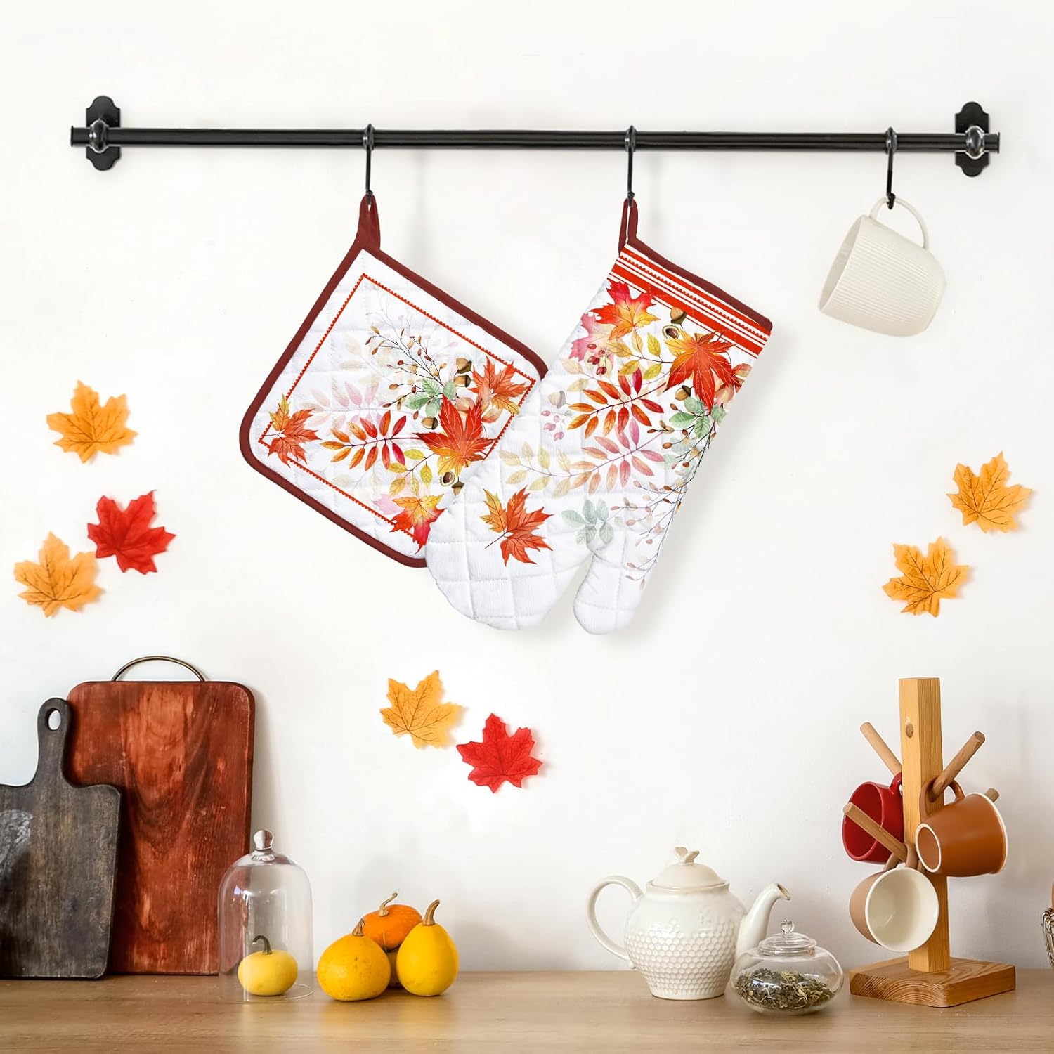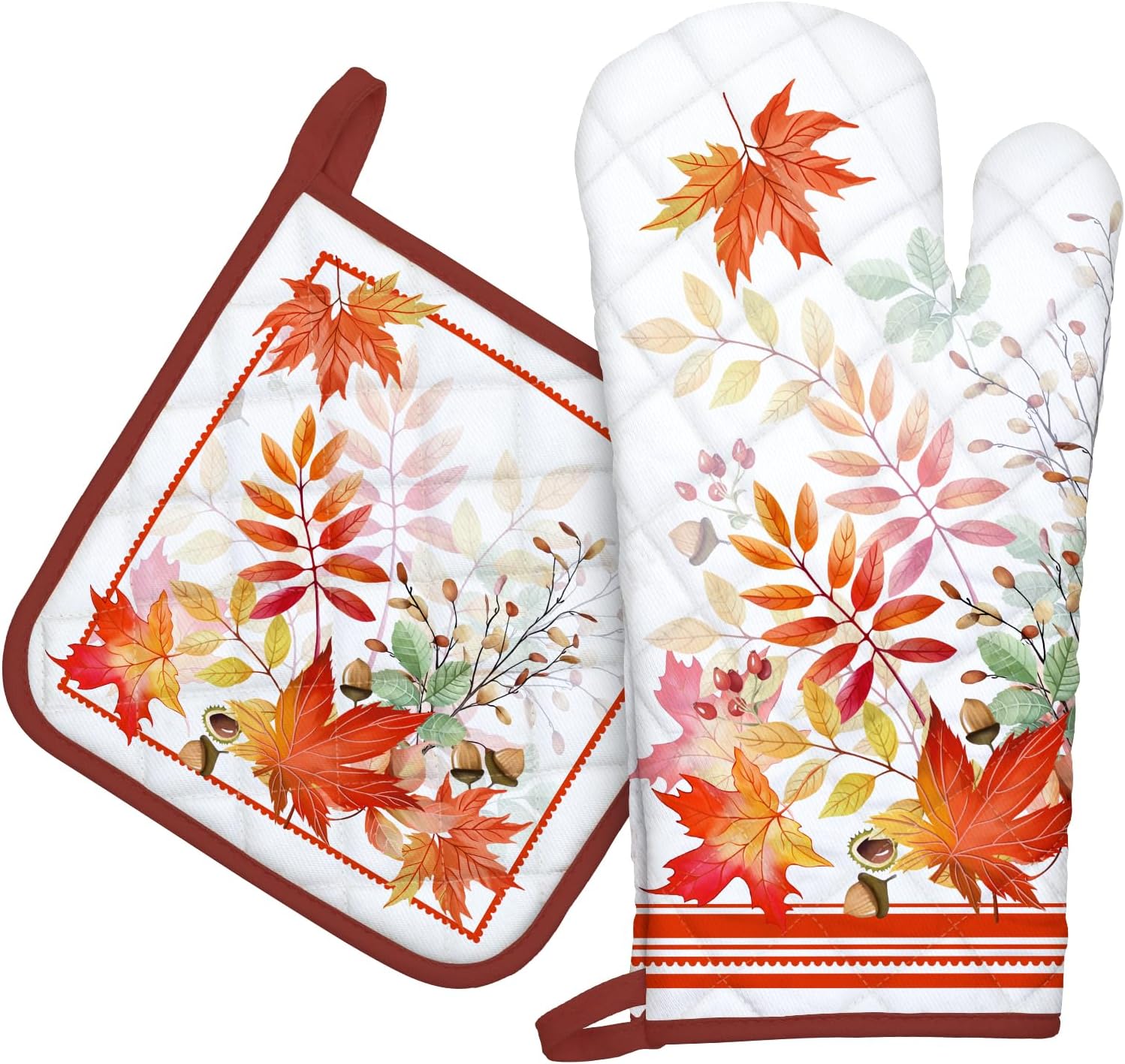 Fall Mapel Leaf Oven Mitts and Pot Holders Sets 2Pcs, 100% Cotton Heat Resistant, Extra Long Oven Gloves Potholder for Kitchen Cooking Baking Decoration