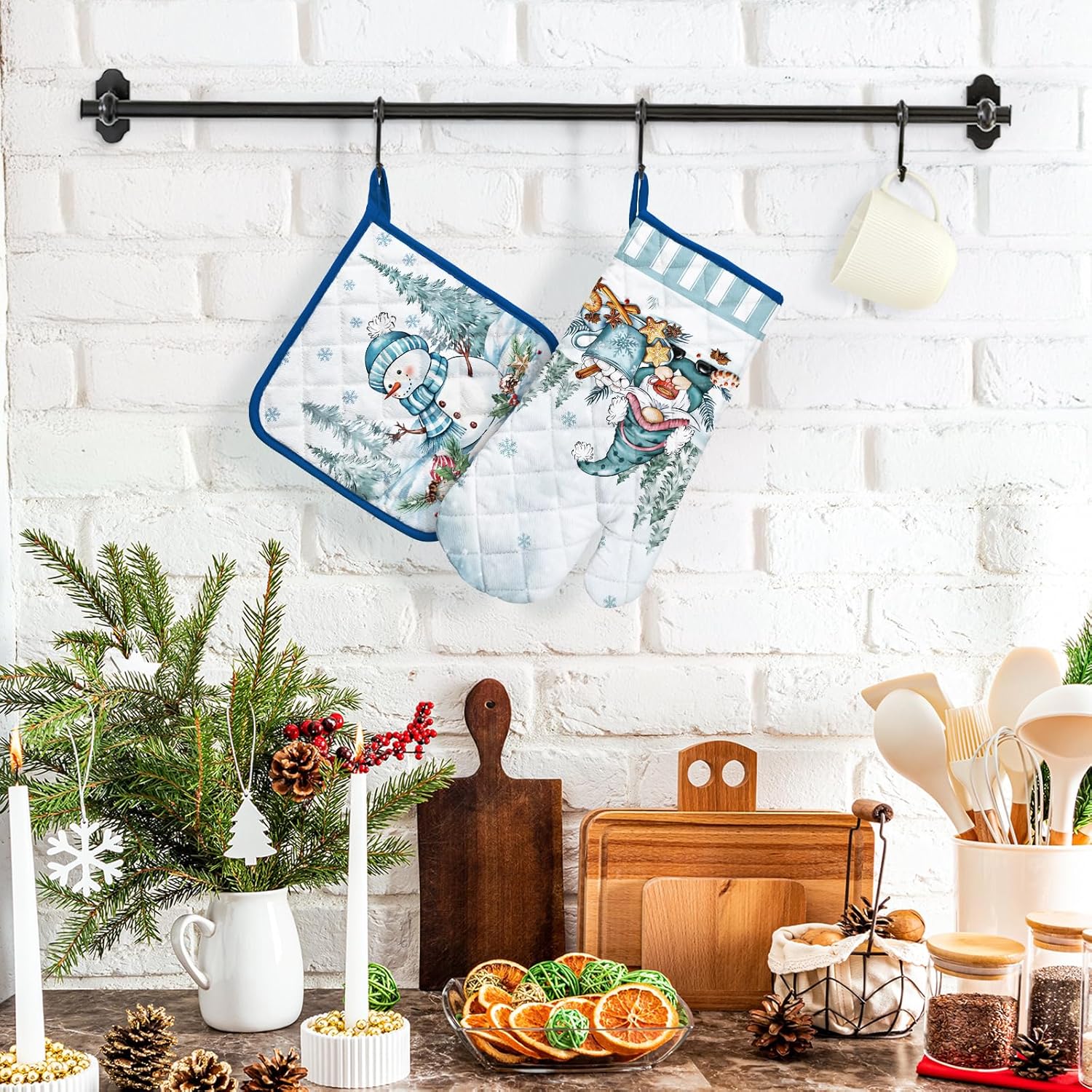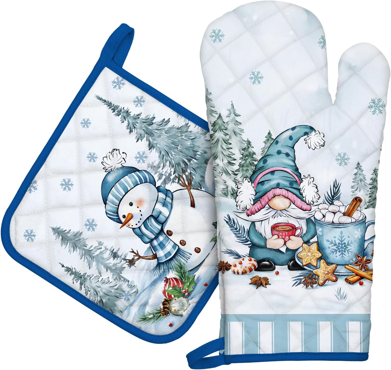 Winter Gnome Oven Mitts and Pot Holders Sets 2Pcs, 100% Cotton Heat Resistant, Extra Long Oven Gloves Potholder for Kitchen Cooking Baking Decoration