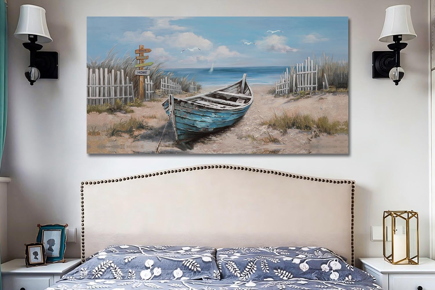 Ardemy Boat Canvas Wall Art for Living Room Large Teal Bedroom Pictures Wall Decor Textured Beach Paintings Artwork Dining Room Home Office Kitchen, 40"x20"