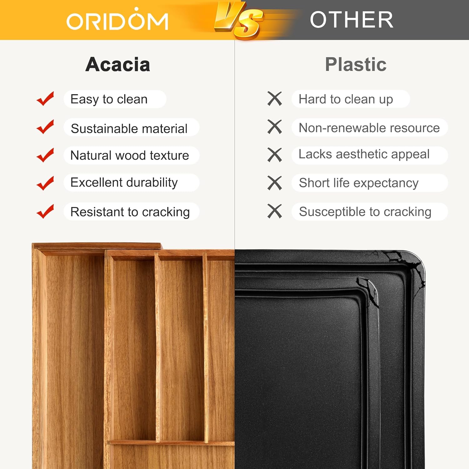 • 【Money -Back Warranty with Oridom】At Oridom, your happiness and satisfaction are at the heart of what we do. We're dedicated to delivering not just premium products, but also top-tier customer service: a full 1-year warranty, a no-questions-asked money-back guarantee, and round-the-clock customer assistance. We're here for you every step of the way, what you can get are high quality acacia utensil organizer for kitchen drawers and friendly customer service.
