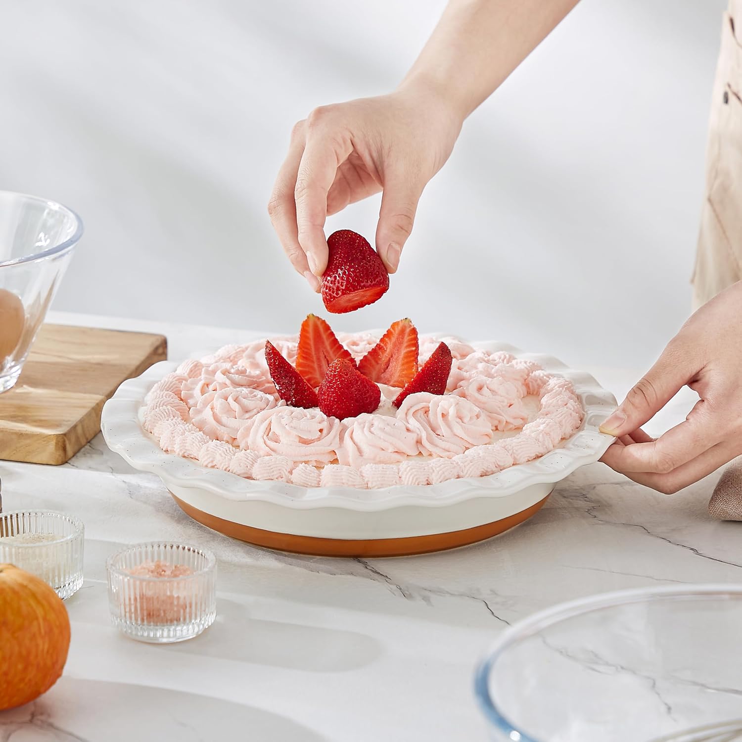 • 【Elegant and Functional Design】Featuring 24 pleated grooves for easy gripping and handling, this pie dish combines elegance with practicality. The modern farmhouse style and fluted edge not only add a touch of sophistication but also help shape your crusts beautifully.