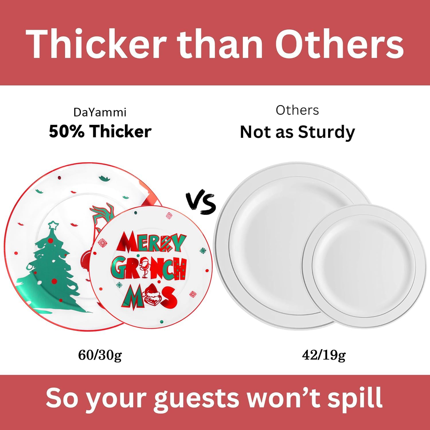 • ELEGANT DESIGN: The Christmas appetizer plates feature the phrase "MERRY GRINCHMAS" along with a snowflake hat pattern in the center, while the plastic plates showcase elf hands, Christmas balls, and tree patterns. These exquisite disposable utensils will enhance the elegance and festive atmosphere of your gathering—perfect for Thanksgiving dinners.