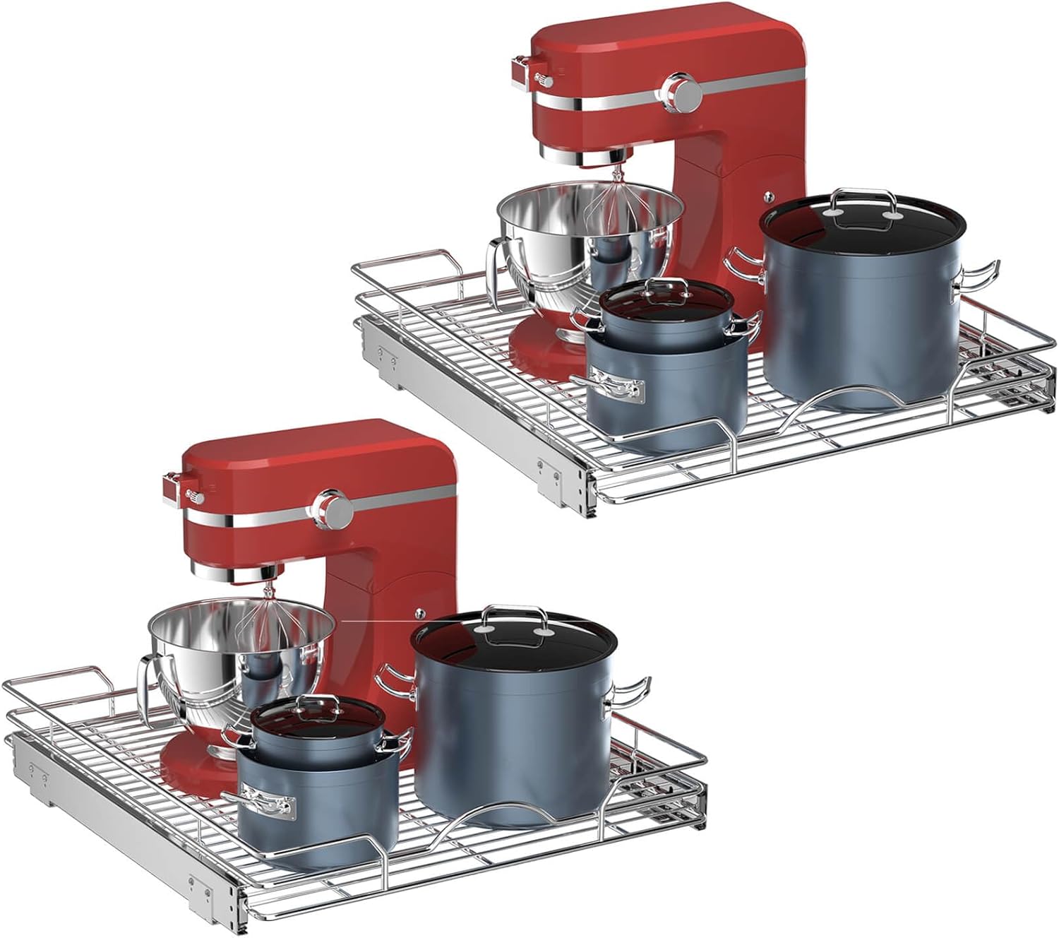 OCG Pull Out Cabinet Organizer 2 Pack (21" W x 21" D), Pull out Shelves 1 Tier, Cabinet Slide Out Shelves for Base Cabinet Organization in Kitchen Bathroom Pantry, Bottom Mount, Chrome Finish