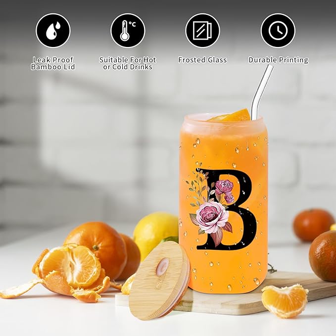 • Personalized Elegance: Elevate your beverage experience with our monogrammed 16oz glass drinking cup, featuring a bamboo lid and straw. Each cup is meticulously customized with one of the 26 letters, making it a perfect gift that reflects personal style and sophistication.