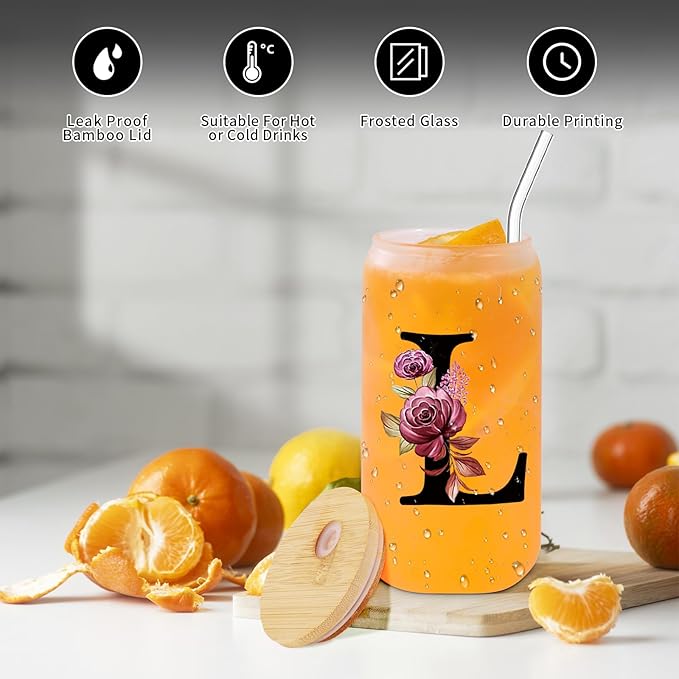 • Personalized Elegance: Elevate your beverage experience with our monogrammed 16oz glass drinking cup, featuring a bamboo lid and straw. Each cup is meticulously customized with one of the 26 letters, making it a perfect gift that reflects personal style and sophistication.