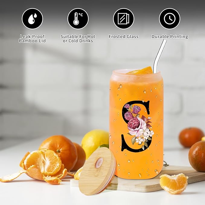 • Personalized Elegance: Elevate your beverage experience with our monogrammed 16oz glass drinking cup, featuring a bamboo lid and straw. Each cup is meticulously customized with one of the 26 letters, making it a perfect gift that reflects personal style and sophistication.