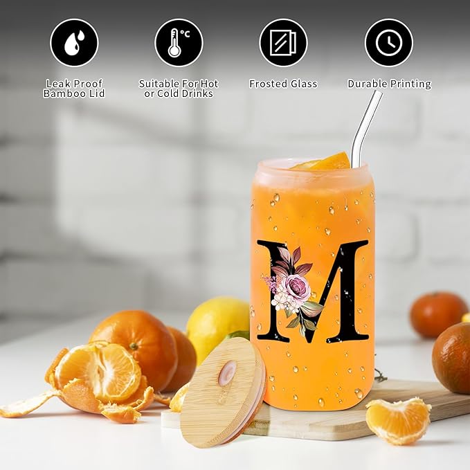 • Personalized Elegance: Elevate your beverage experience with our monogrammed 16oz glass drinking cup, featuring a bamboo lid and straw. Each cup is meticulously customized with one of the 26 letters, making it a perfect gift that reflects personal style and sophistication.