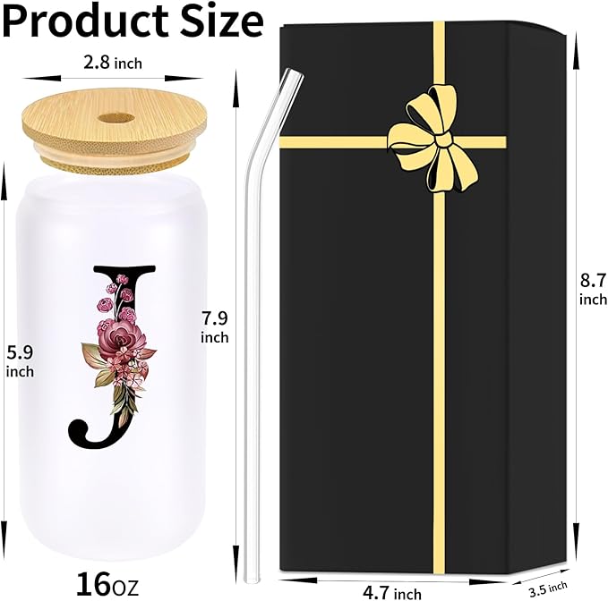 Monogrammed Glass Drinking Cup With Lid Straw Women Her Sister Mom Girlfriend Aunt Best Friend Friendship Grandma Bestie Wife Daughter Law Lady Happy Birthday Gifts Cool Funny Meaningful Unique Cute,J