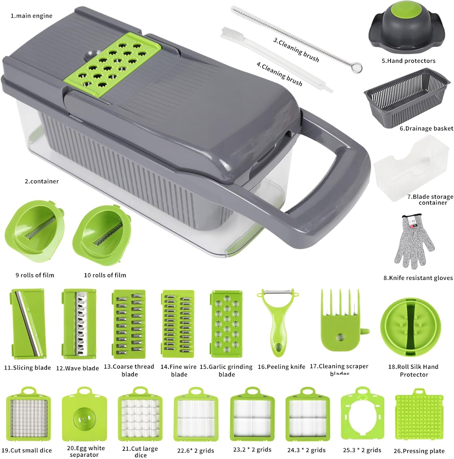Multifunctional vegetable cutter 26 in 1 vegetable slicer, cucumber slicer, potatoes, tomatoes, zucchini, garlic, eggs, vegetable cutter with container and lid, salad cutter, dicing machine, shredder